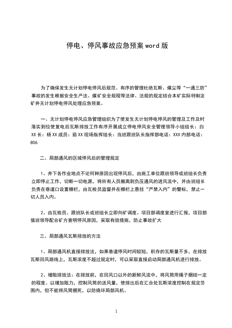 一、无计划停电停风应急管理组织为了使发生无计划停电停风的管理及工作及时落实到位使复电后瓦斯排放工作有序开展成立停电停风安全管理领导小组组长:白XX长:杨XX成员:茹XX现场指挥组长:当班跟班队长指挥部电话:XXX内部电话:806