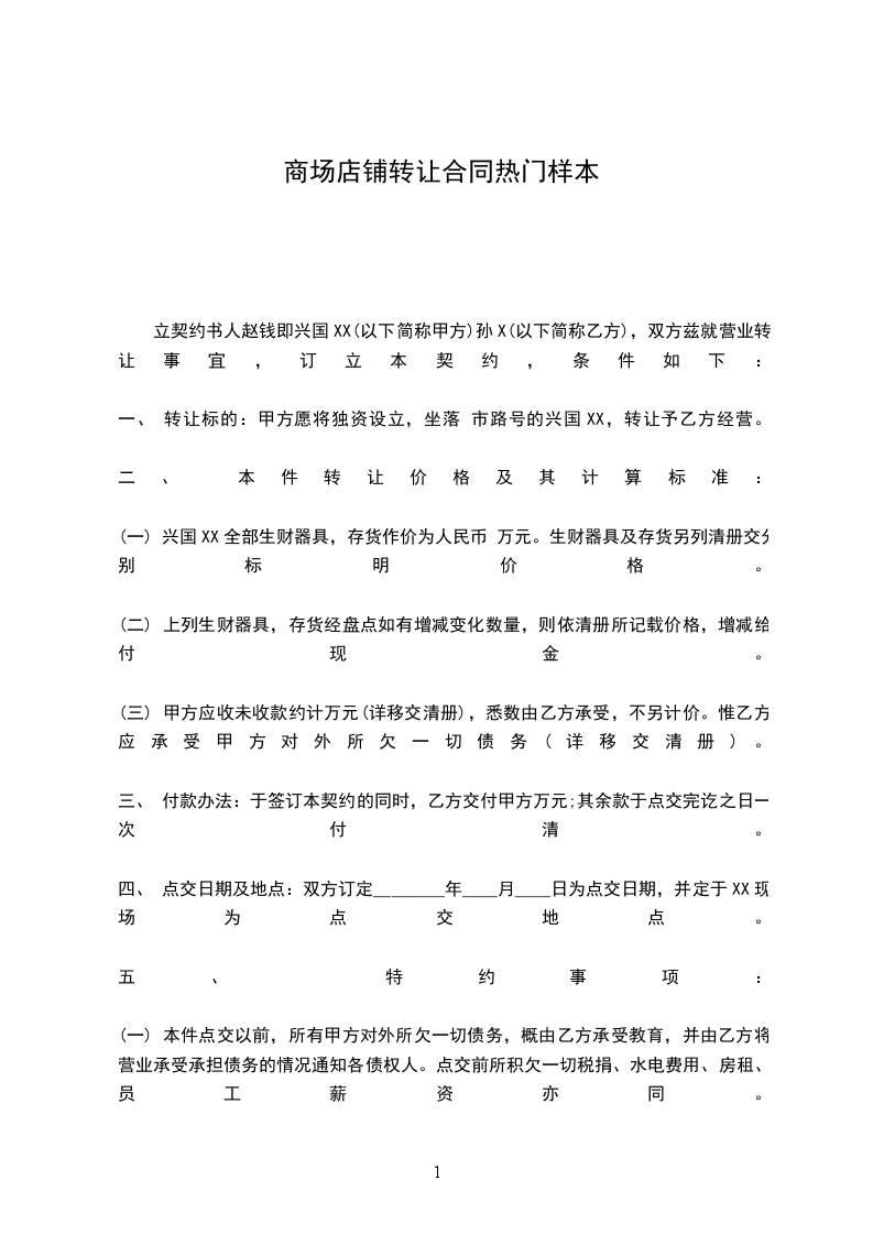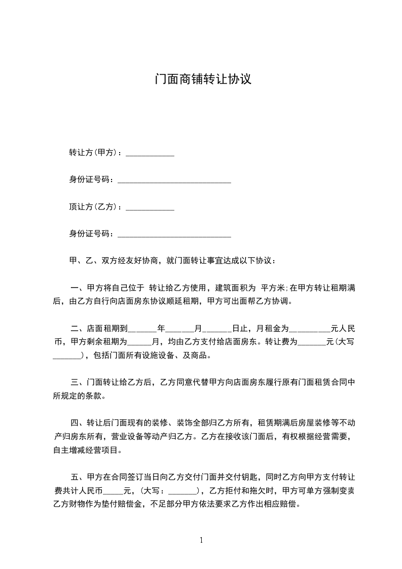转让方(甲方):身份证号码:长住地址:顶让方(乙方):身份证号码:长住地址:房东(丙方):身份证号码:长住地址:甲、乙、丙三方经友好协商,就店铺转让事宜达成