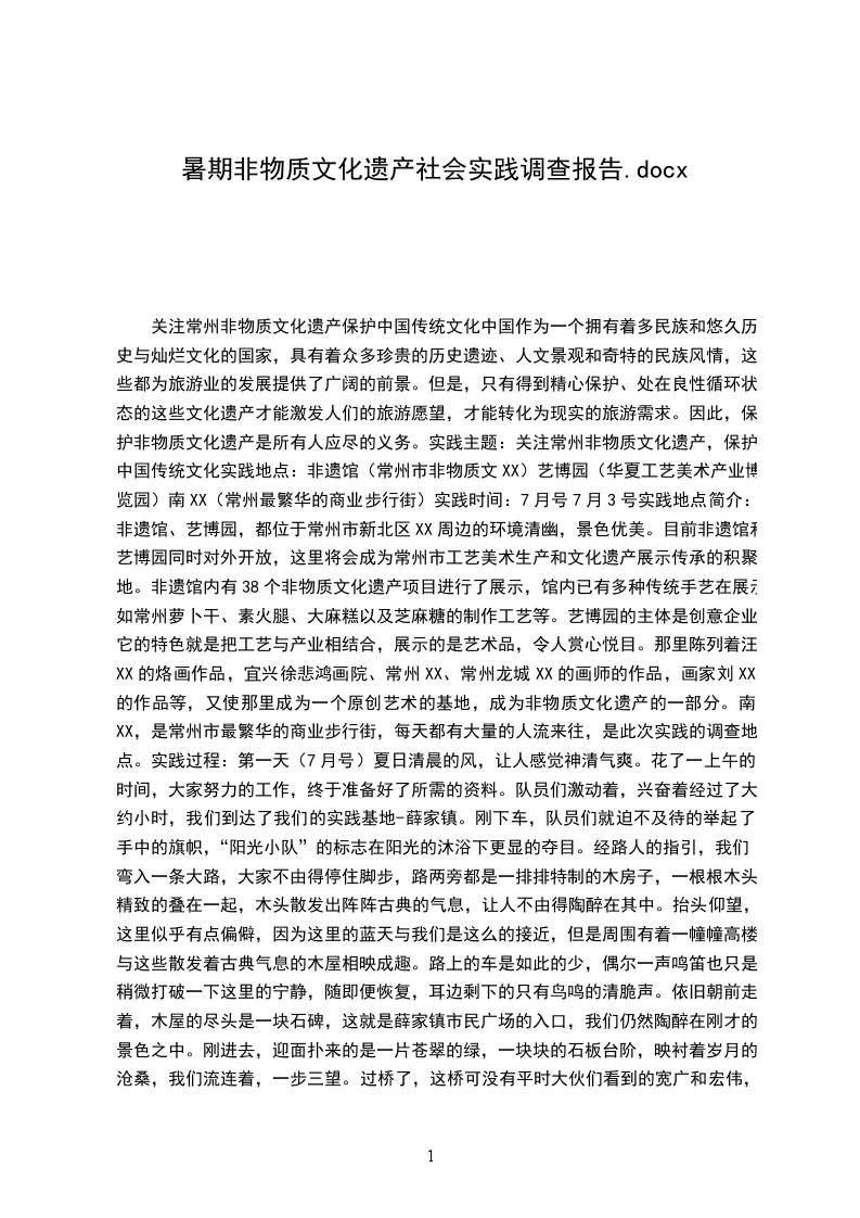 关注常州非物质文化遗产保护中国传统文化中国作为一个拥有着多民族和悠久历史与灿烂文化的国家,具有着众多珍贵的历史遗迹、人文景观和奇特的民族风情,这些都为旅游业的发展提供了广阔的前景。但是,只有得到精心保护、处在良性循环状态的这些文化遗产才能激发人们的旅游愿望,才能转化为现实的旅游需求。因此,保护非物质文化遗产是所有人应尽的义务。实践主题:关注常州非物质文化遗产,保护中国传统文化实践地点:非遗馆(常州市非物质文XX)艺博园(华夏工艺美术产业博览园)南XX(常州最繁华的商业步行街)实践时间:7月号7月3号实践地点简介:非遗馆、艺博园,都位于常州市新北区XX周边的环境清幽,景色优美。目前非遗馆和艺博园同时对外开放,这里将会成为常州市工艺美术生产和文化遗产展示传承的积聚地。非遗馆内有38个非物质文化遗产项目进行了展示,馆内已有多种传统手艺在展示,如常州萝卜干、素火腿、大麻糕以及芝麻糖的制作工艺等。艺博园的主体是创意企业,它的特色就是把工艺与产业相结合,展示的是艺术品,令人赏心悦目。那里陈列着汪XX的烙画作品,宜兴徐悲鸿画院、常州XX、常州龙城XX的画师的作品,画家刘XX的作品等,又使那里成为一个原创艺术的基地,成为非物质文化遗产的一部分。南XX,是常州市最繁华的商业步行街,每天都有大量的人流来往,是此次实践的调查地点。实践过程:第一天(7月号)夏日清晨的风,让人感觉神清气爽。花了一上午的时间,大家努力的工作,终于准备好了所需的资料。队员们激动着,兴奋着经过了大约小时,我们到达了我们的实践基地-薛家镇。刚下车,队员们就迫不及待的举起了手中的旗帜,“阳光小队”的标志在阳光的沐浴下更显的夺目。经路人的指引,我们弯入一条大路,大家不由得停住脚步,路两旁都是一排排特制的木房子,一根根木头精致的叠在一起,木头散发出阵阵古典的气息,让人不由得陶醉在其中。抬头仰望,这里似乎有点偏僻,因为这里的蓝天与我们是这么的接近,但是周围有着一幢幢高楼,与这些散发着古典气息的木屋相映成趣。路上的车是如此的少,偶尔一声鸣笛也只是稍微打破一下这里的宁静,随即便恢复,耳边剩下的只有鸟鸣的清脆声。依旧朝前走着,木屋的尽头是一块石碑,这就是薛家镇市民广场的入口,我们仍然陶醉在刚才的景色之中。刚进去,迎面扑来的是一片苍翠的绿,一块块的石板台阶,映衬着岁月的沧桑,我们流连着,一步三望。过桥了,这桥可没有平时大伙们看到的宽广和宏伟,它只是一块厚实的石板桥,桥面上刻的不知是哪个年代的文字,人站在桥上,一种不知名的情感油然而生。桥下清澈的河水,水面上游动的鱼儿,不禁给人一种小桥流水般的感觉。这就是常州非物质文化遗产展示馆周边的优美的环境,它非凡的气质,丰富的文化底蕴,一定会吸引着更多的人。“走啦”,大家才似乎梦醒,轻快的步伐,欢快的语调,带着无比自豪的心情来到了对面的岸上,“常州非物质文化遗产展示馆”一行铿锵有力的大字出现在我们面前,大家被这门前的气势所震撼,停下脚步,细细观摩,这些大字在周围绿色的映衬下显得更打动人。不知何时,一位中年师傅走了过来,我们激动的跑了过去,还没等我们开口,大叔就笑着对我们说,“你们是来参观的吧”,我们急忙自我介绍了一下,并问了大叔好多关于非遗馆的问题,大叔一一作了回答,还带我们进馆内参观。跨过一个高的门槛,空荡荡的院子,更增添了一丝的幽静。又进入了一个门,一股木质的香味儿飘来,里面整整齐齐的摆放着桌椅,两面墙上都写满了对常州多个非物质文化遗产的介绍,靠墙的地方摆放着一排整齐的玻璃柜,里面有包装精美的常州特产-萝卜干,绿色的包装盒给人清新的感觉;里面有常州著名的木梳篦,人物梳篦上栩栩如生的人物令人拍手叫绝,对称的双鱼梳篦让人流连忘返;里面有常州知名的酒,精美的包装里透着高贵,纯纯的液体中散着香醇;墙上酒的制作工序,让人眼花缭乱,不得不佩服古代人的聪明才智。跟着大叔的步伐,我们来到了一条小巷,靠边上的一间算是非遗馆的藏书阁了,一堆堆的书整齐的排放,里面的工作人员正辛苦的整理着,准备尽快的借阅给前来参观的人,以便更了解常州的非物质文化遗产。过了这间房,我们扛着旗帜进了间大房子,天呐,里面竟然整齐的摆放着几张乒乓球桌,几位老年人在练乒乓球。“他们是来锻炼身体的”,引导我们的大叔说,四面的墙上散发着古典的气息,与这现代的气息相结合,真是别有一番风味。进了最后的大院子,四面的墙上是常州特产萝卜干、素火腿的制作工序,看着那一幅幅照片,令人垂涎三尺。进了里屋,好整齐的桌子,干净的凳子,墙壁上挂着“侨台之家”,顿时给人一种温馨之感,原来这是侨胞们的家园,设计独特,又是这里的一大看点。接着在馆领导人的热情介绍下,我们来到了近邻-华夏XX,这是艺博园的首栋工美大楼,它与非遗馆毗邻,目前已有5家工美企业入驻,其中包括孙XX乱针绣艺术创作中心、狄静乱针绣工作室、单银娣乱针绣工作室。它壮观的外形与非遗馆形成鲜明的对比,让人不由得想进去看看。过了马路,艺博园的一位负责人便迎了过来,“常工院的同学们,欢迎欢迎”,刚走进大门,里面的宽敞和明亮瞬间闯进我们的双眼。“我带你们参观参观吧”,随即,负责人带领我们进了一家店,