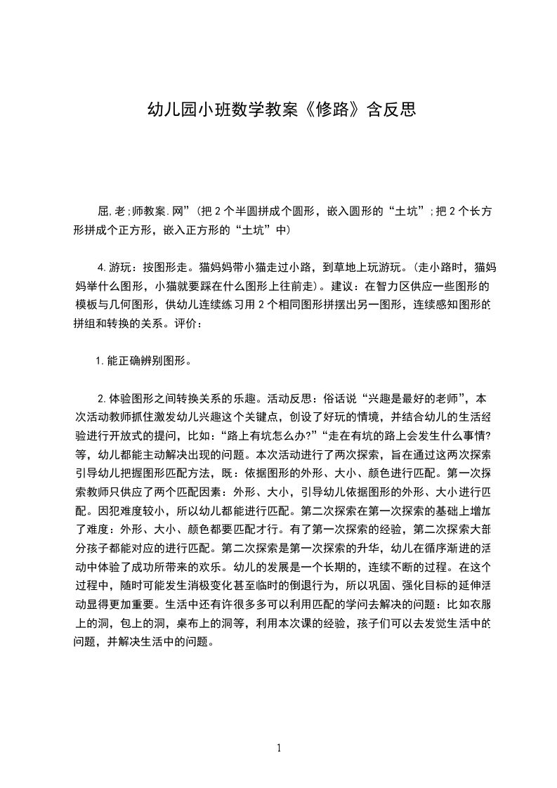3、幼儿修路,辨知图形。教师先带领幼儿观看一下小路有哪些图形,然后请幼儿拿石块一一对应地嵌入小路的土坑中。