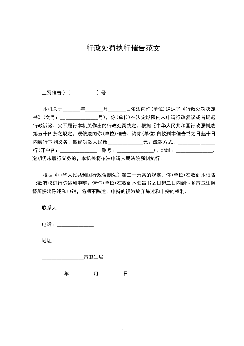 本机关于_______年_______月_______日依法向你(单位)送达了《行政处罚决定书》(文号:_______________号),你(单位)在法定期限内未申请行政复议或者提起行政诉讼,又不履行本机关作出的行政处罚决定。根据《中华人民共和国行政强制法》第五十四条之规定,现依法向你(单位)催告,请你(单位)自收到本催告书之日起十日内履行下列义务:缴纳罚款人民币______________元。缴款方式:_______________行(开户名:_______________,账号:_______________),地址:_______________。逾期仍未履行义务的,本机关将依法申请人民法院强制执行。