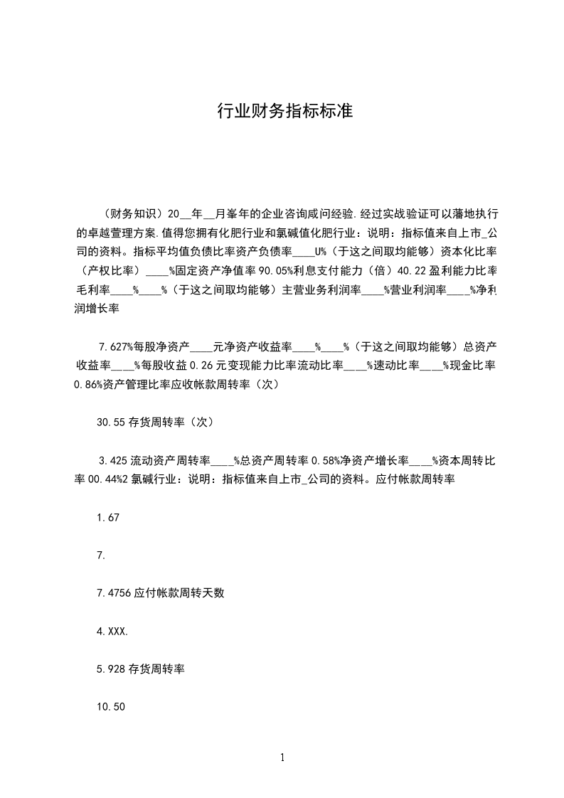 (财务知识)20__年__月峯年的企业咨询咸问经验.经过实战验证可以藩地执行的卓越萱理方案.值得您拥有化肥行业和氯碱值化肥行业:说明:指标值来自上市_公司的资料。指标平均值负债比率资产负债率____U%(于这之间取均能够)资本化比率(产权比率)____%固定资产净值率90.05%利息支付能力(倍)40.22盈利能力比率毛利率____%____%(于这之间取均能够)主营业务利润率____%营业利润率____%净利润增长率