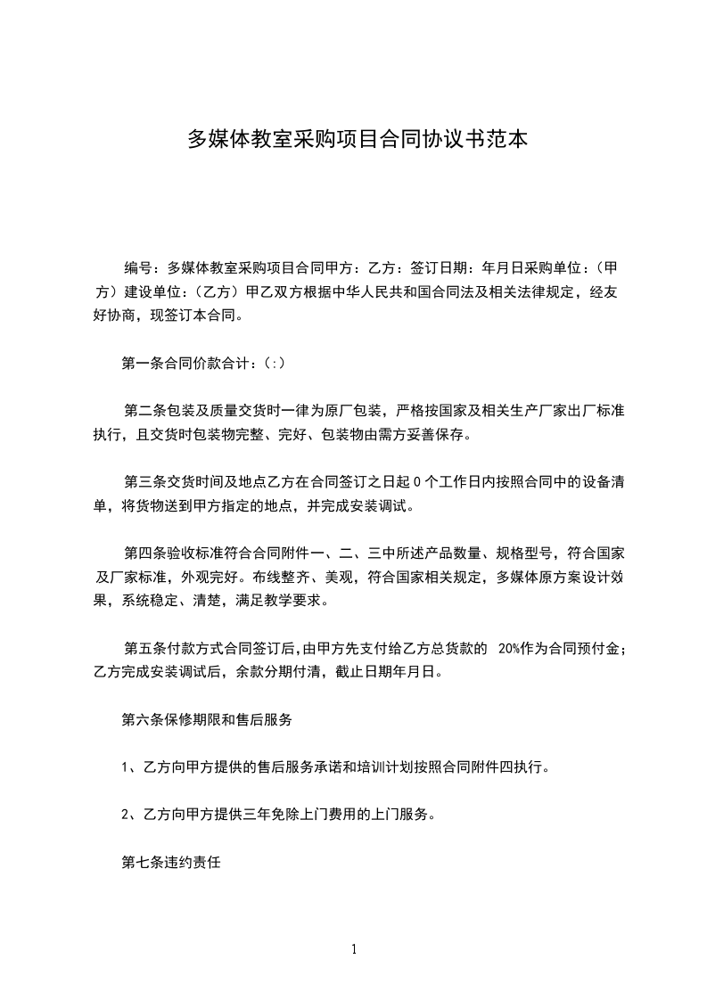 编号:多媒体教室采购项目合同甲方:乙方:签订日期:年月日采购单位:(甲方)建设单位:(乙方)甲乙双方根据中华人民共和国合同法及相关法律规定,经友好协商,现签订本合同。