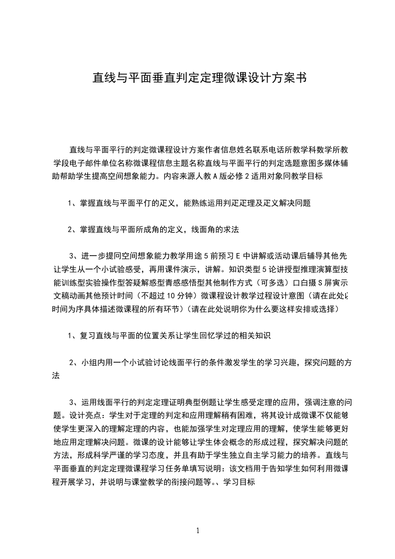 六、教学过程:学习环节学习目标学习评价学习活动设计意图生活现象引入新课目标观察学生摆出的线面关系是否正确.判断学生是否积累大量生活中对直线与平面垂直的形象.引入:让学生用笔和纸摆出直线与平面的三种位置关系;通过引导,让学生摆出直线与平面相交时最特殊的情况,带领学生进入直线与平面垂直关系的学习请大家列举生活中常见的直线与平面垂直的例子并展示图片引导学生数学学习过程中从一般到特殊的研究规律.主动探索抽象概念目标观察学生能否根据老师引导,正确进行实验操作,并在观察、分析中达到预设目标.观察学生的探究活动能否在老师指导中顺利展开,是否在活动中有思考,有获得.听学生的描述,能否准确表达出直线与平面垂直的定义.根据学生的回答判定学生是否准确掌握定义的内涵.思考:如何定义直线与平面垂直的概念?关于垂直你掌握了什么?2能否类比直线与直线垂直的学习中,将异面直线转化为相交直线的思路,将线面垂直的问题转化为线线垂直的问题分组活动: