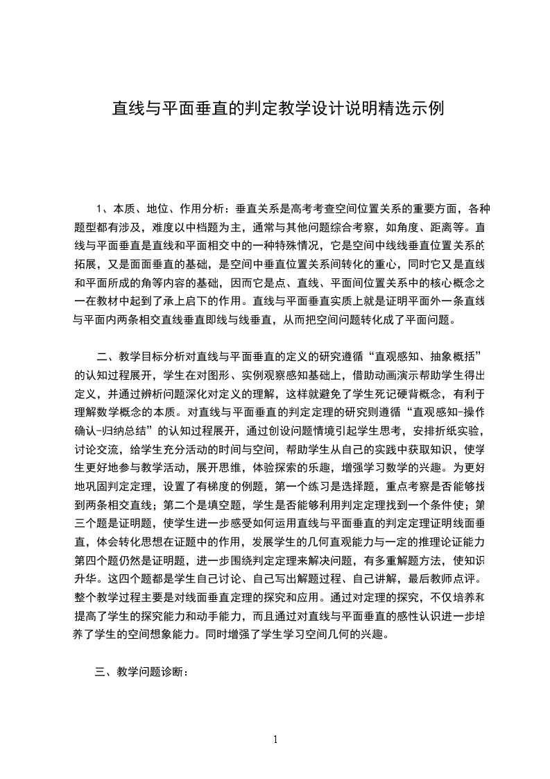 四、教学策略分析:新课程标准明确指出:数学教学活动应激发学生兴趣,调动学生积极性,引发学生的数学思考,鼓励学生的创造性思维.因此本节课在“目标导引教学”这一理念的指引下,主要采用的是引导发现教学法.教学中,我利用学生感兴趣的图片引出直线与平面垂直的形象,抽象出直线与平面垂直的概念.让学生在分析操作过程发现规律特点,从而自发地生成定义;接着让学生在实际应用中自觉提出判定直线与平面垂直是否有更简洁方便的方法,通过折纸活动,让学生在游戏中学习,在活动中获得知识.我设计了分组探究等实践活动,通过活动引导学生进行观察、思考、操作、归纳、应用,使学生始终处于积极、主动、有趣的学习状态中,深刻体会到了“做数学、学数学”的乐趣,最终达成了本节课的学习目标.