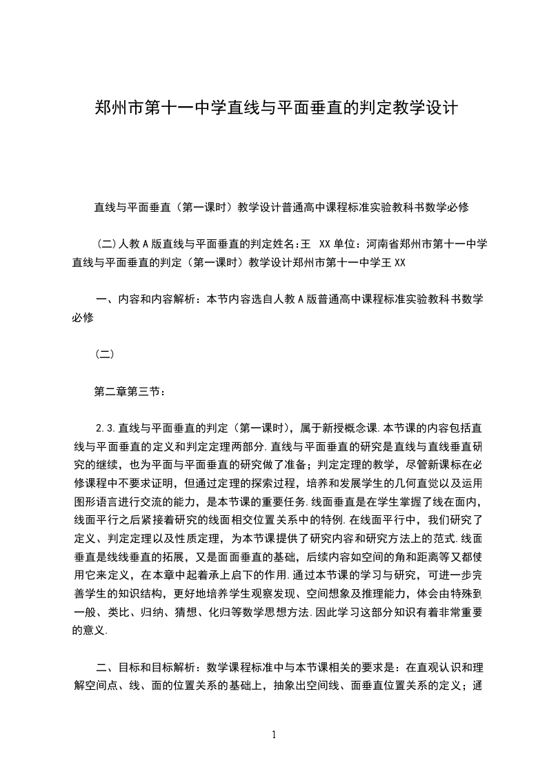 (二)人教A版直线与平面垂直的判定姓名:王XX单位:河南省郑州市第十一中学直线与平面垂直的判定(第一课时)教学设计郑州市第十一中学王XX