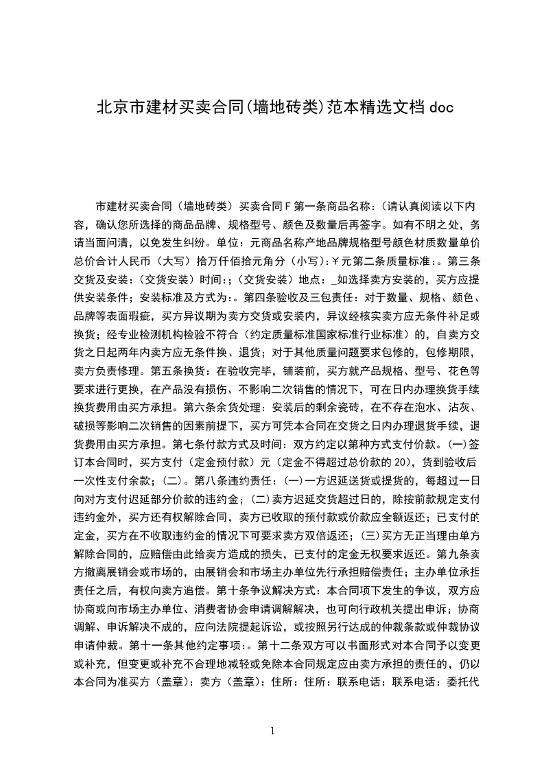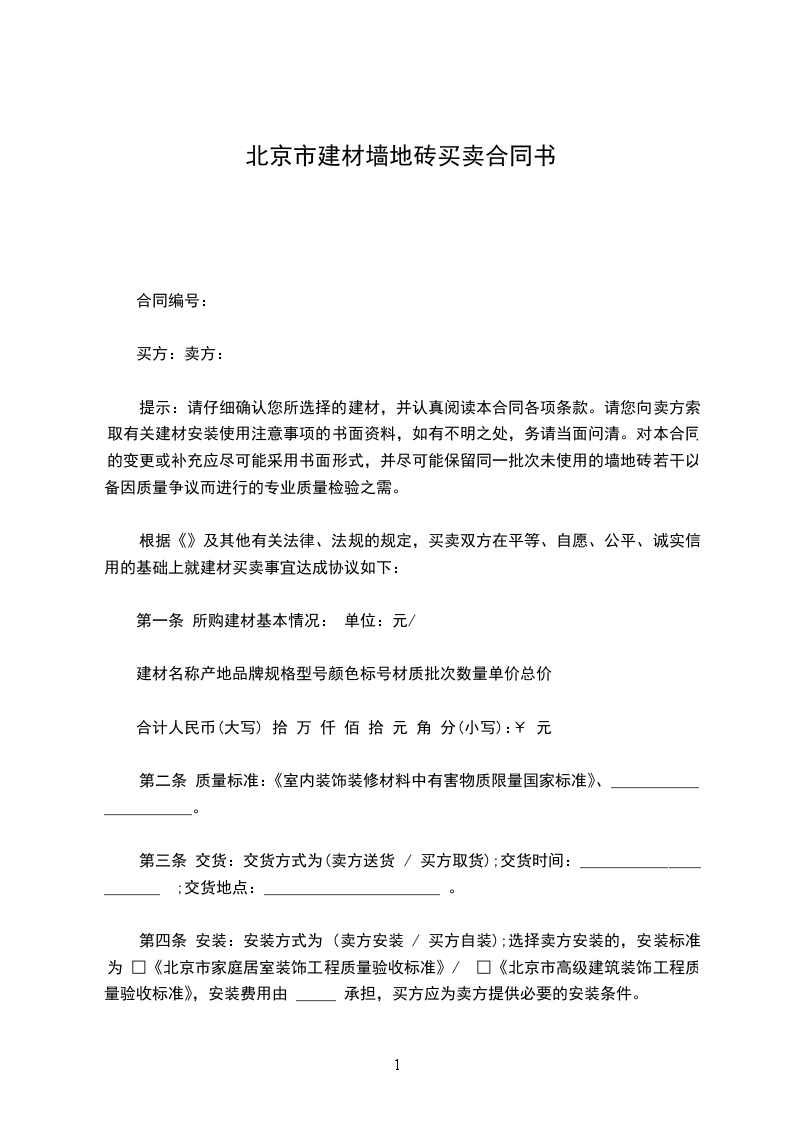 编号:北京市墙地砖建材买卖合同买方:卖方:签订日期:年月日提示:请仔细确认您所选择的建材,并认真阅读本合同各项条款。请您向卖方索取有关建材安装使用注意事项的书面资料,如有不明之处,务请当面问清。对本合同的变更或补充应尽可能采用书面形式,并尽可能保留同一批次未使用的墙地砖若干以备因质量争议而进行的专业质量检验之需。根据中华人民共和国合同法及其他有关法律、法规的规定,买卖双方在平等、自愿、公平、诚实信用的基础上就建材买卖事宜达成协议如下:
