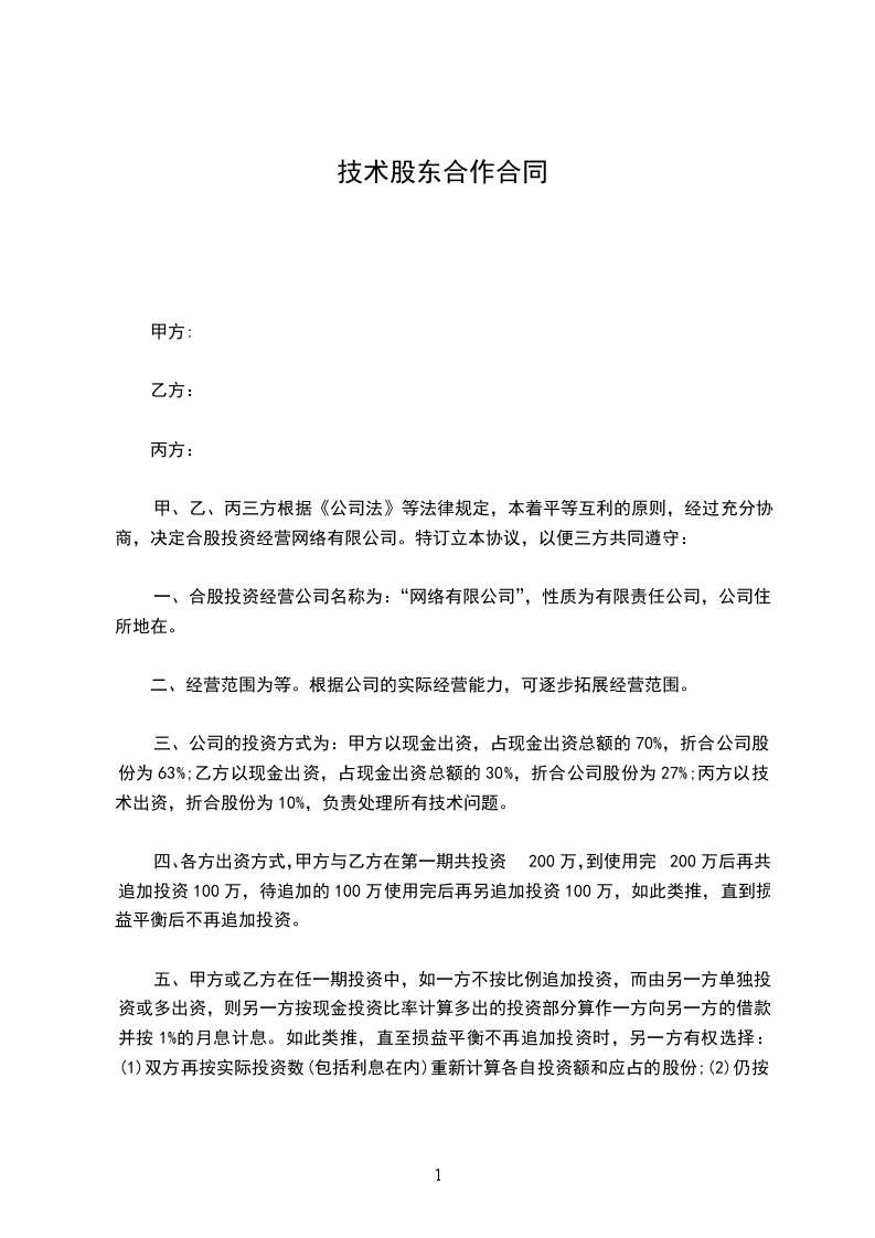 三、公司的投资方式为:甲方以现金出资,占现金出资总额的70%,折合公司股份为63%;乙方以现金出资,占现金出资总额的30%,折合公司股份为27%;丙方以技术出资,折合股份为10%,负责处理所有技术问题。