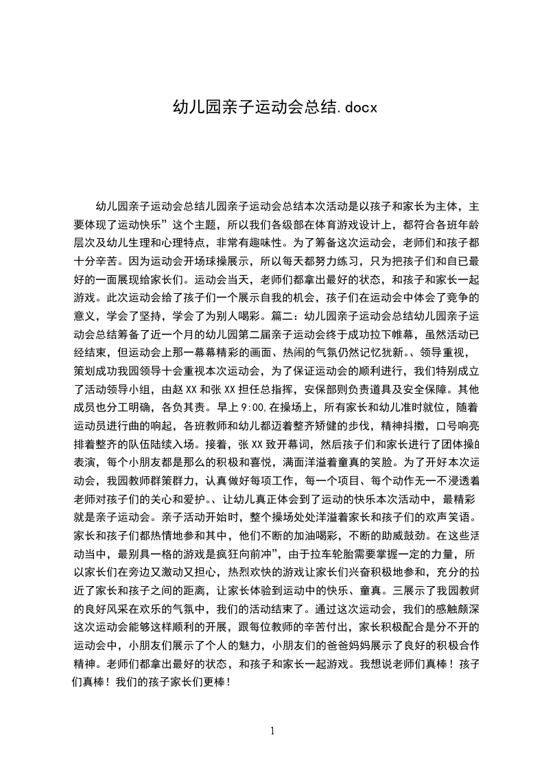 幼儿园亲子运动会总结儿园亲子运动会总结本次活动是以孩子和家长为主体,主要体现了运动快乐”这个主题,所以我们各级部在体育游戏设计上,都符合各班年龄层次及幼儿生理和心理特点,非常有趣味性。为了筹备这次运动会,老师们和孩子都十分辛苦。因为运动会开场球操展示,所以每天都努力练习,只为把孩子们和自已最好的一面展现给家长们。运动会当天,老师们都拿出最好的状态,和孩子和家长一起游戏。此次运动会给了孩子们一个展示自我的机会,孩子们在运动会中体会了竞争的意义,学会了坚持,学会了为别人喝彩。篇二:幼儿园亲子运动会总结幼儿园亲子运动会总结筹备了近一个月的幼儿园第二届亲子运动会终于成功拉下帷幕,虽然活动已经结束,但运动会上那一幕幕精彩的画面、热闹的气氛仍然记忆犹新。、领导重视,策划成功我园领导十会重视本次运动会,为了保证运动会的顺利进行,我们特别成立了活动领导小组,由赵XX和张XX担任总指挥,安保部则负责道具及安全保障。其他成员也分工明确,各负其责。早上9:00,在操场上,所有家长和幼儿准时就位,随着运动员进行曲的响起,各班教师和幼儿都迈着整齐矫健的步伐,精神抖擞,口号响亮,排着整齐的队伍陆续入场。接着,张XX致开幕词,然后孩子们和家长进行了团体操的表演,每个小朋友都是那么的积极和喜悦,满面洋溢着童真的笑脸。为了开好本次运动会,我园教师群策群力,认真做好每项工作,每一个项目、每个动作无一不浸透着老师对孩子们的关心和爱护。、让幼儿真正体会到了运动的快乐本次活动中,最精彩就是亲子运动会。亲子活动开始时,整个操场处处洋溢着家长和孩子们的欢声笑语。家长和孩子们都热情地参和其中,他们不断的加油喝彩,不断的助威鼓劲。在这些活动当中,最别具一格的游戏是疯狂向前冲”,由于拉车轮胎需要掌握一定的力量,所以家长们在旁边又激动又担心,热烈欢快的游戏让家长们兴奋积极地参和,充分的拉近了家长和孩子之间的距离,让家长体验到运动中的快乐、童真。三展示了我园教师的良好风采在欢乐的气氛中,我们的活动结束了。通过这次运动会,我们的感触颇深。这次运动会能够这样顺利的开展,跟每位教师的辛苦付出,家长积极配合是分不开的。运动会中,小朋友们展示了个人的魅力,小朋友们的爸爸妈妈展示了良好的积极合作精神。老师们都拿出最好的状态,和孩子和家长一起游戏。我想说老师们真棒!孩子们真棒!我们的孩子家长们更棒!