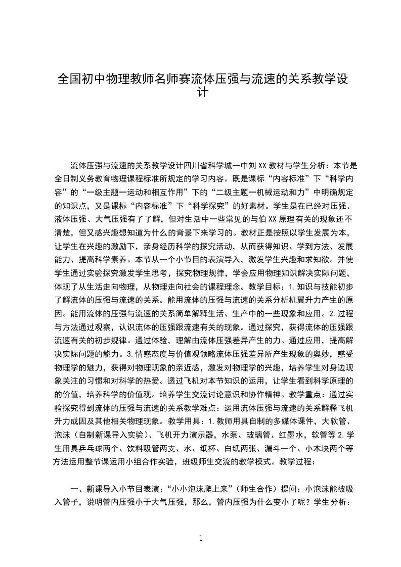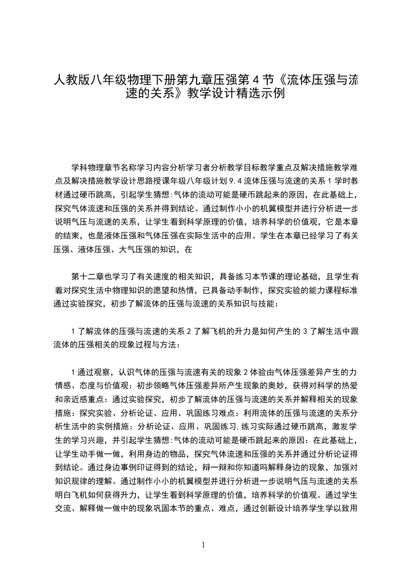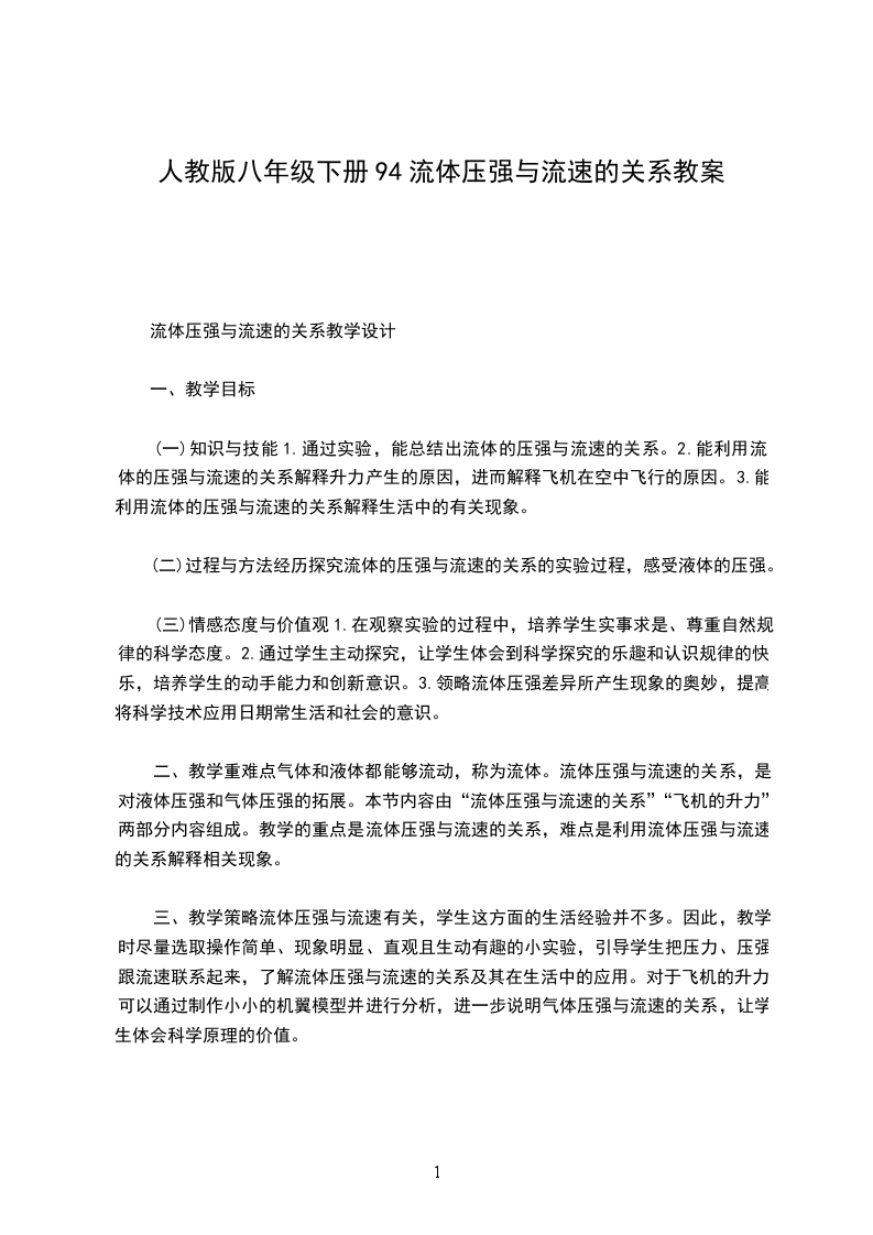 新人教版初中物理九年级《流体压强与流速的关系》学案word文档