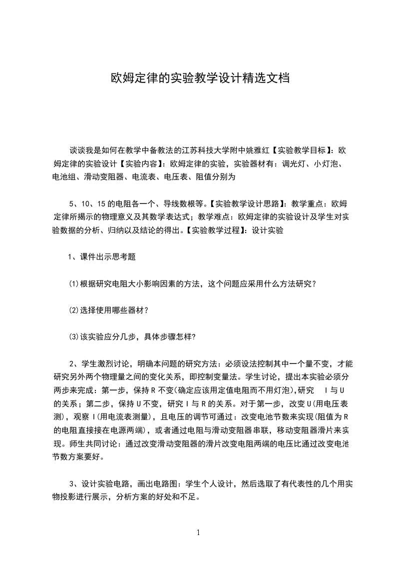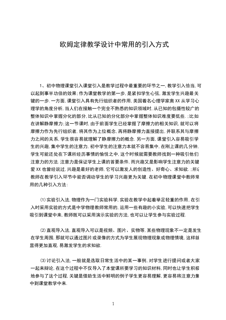3、欧姆精神教育“欧姆定律”是德国物理XX姆通过大量的实验得到的。欧姆探索电流与电压、电阻关系的过程耗费了欧姆大量的时间和精力。体现了欧姆尊重事实、用事实说话、不畏艰辛勇于探索的科学精神。这一精神是人类可贵的财富,也正是我们学生所需要的。
