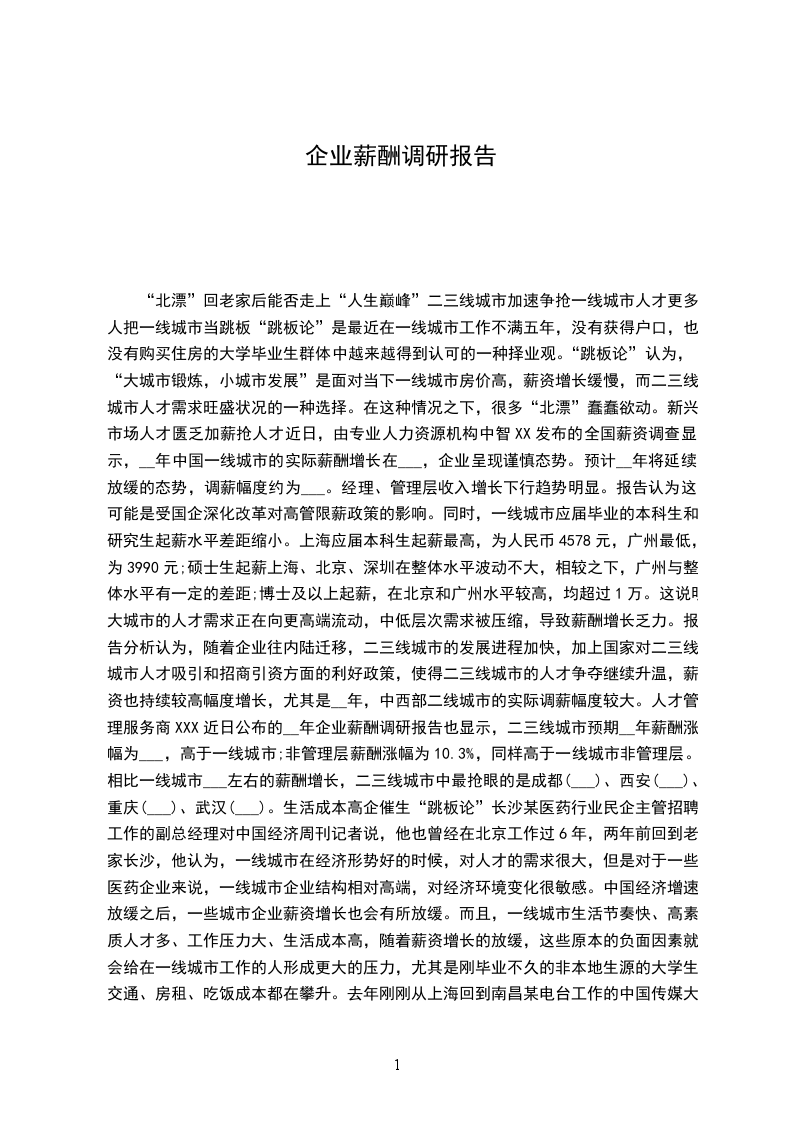 “北漂”回老家后能否走上“人生巅峰”二三线城市加速争抢一线城市人才更多人把一线城市当跳板“跳板论”是最近在一线城市工作不满五年,没有获得户口,也没有购买住房的大学毕业生群体中越来越得到认可的一种择业观。“跳板论”认为,“大城市锻炼,小城市发展”是面对当下一线城市房价高,薪资增长缓慢,而二三线城市人才需求旺盛状况的一种选择。在这种情况之下,很多“北漂”蠢蠢欲动。新兴市场人才匮乏加薪抢人才近日,由专业人力资源机构中智XX发布的全国薪资调查显示,__年中国一线城市的实际薪酬增长在___,企业呈现谨慎态势。预计__年将延续放缓的态势,调薪幅度约为___。经理、管理层收入增长下行趋势明显。报告认为这可能是受国企深化改革对高管限薪政策的影响。同时,一线城市应届毕业的本科生和研究生起薪水平差距缩小。上海应届本科生起薪最高,为人民币4578元,广州最低,为3990元;硕士生起薪上海、北京、深圳在整体水平波动不大,相较之下,广州与整体水平有一定的差距;博士及以上起薪,在北京和广州水平较高,均超过1万。这说明大城市的人才需求正在向更高端流动,中低层次需求被压缩,导致薪酬增长乏力。报告分析认为,随着企业往内陆迁移,二三线城市的发展进程加快,加上国家对二三线城市人才吸引和招商引资方面的利好政策,使得二三线城市的人才争夺继续升温,薪资也持续较高幅度增长,尤其是__年,中西部二线城市的实际调薪幅度较大。人才管理服务商XXX近日公布的__年企业薪酬调研报告也显示,二三线城市预期__年薪酬涨幅为___,高于一线城市;非管理层薪酬涨幅为10.3%,同样高于一线城市非管理层。相比一线城市___左右的薪酬增长,二三线城市中最抢眼的是成都(___)、西安(___)、重庆(___)、武汉(___)。生活成本高企催生“跳板论”长沙某医药行业民企主管招聘工作的副总经理对中国经济周刊记者说,他也曾经在北京工作过6年,两年前回到老家长沙,他认为,一线城市在经济形势好的时候,对人才的需求很大,但是对于一些医药企业来说,一线城市企业结构相对高端,对经济环境变化很敏感。中国经济增速放缓之后,一些城市企业薪资增长也会有所放缓。而且,一线城市生活节奏快、高素质人才多、工作压力大、生活成本高,随着薪资增长的放缓,这些原本的负面因素就会给在一线城市工作的人形成更大的压力,尤其是刚毕业不久的非本地生源的大学生,交通、房租、吃饭成本都在攀升。去年刚刚从上海回到南昌某电台工作的中国传媒大学硕士毕业生王X给中国经济周刊记者算了一笔账,在上海工作每月房租2500元、电话上网费500元、交通500元、吃饭买东西3500元,再加上每年回家的火车票,一个月7000块钱的工资能维持“月光”就已经很不错,有时候还需要家里接济。她说,回到南昌后,每月5000元的工资虽然比上海有所减少,但是毕竟家里已经在南昌给自己买好了房子,不用再交房租,现在每月能存下__多元,加上刚刚发的2万多元年终奖,春节后打算贷款买车,而这在上海是想都不敢想的。她还对记者说,“5000元的月薪在南昌属于中高水平,这得益我之前在上海的工作经历,回到南昌后我用在上海学到的东西开办了新的节目,也在短时间内做到主编一职,所以我认轻人毕业后在大城市锻炼一下是很有必要的。”记者采访发现,房租和吃饭已经成为一线城市“北漂”一族的主要压力,综合记者采访的12位大学毕业五年以内人员的回答发现,他们的吃饭成本和房租成本每年上涨10 %,平均占他们收入的40`%,“月光族”的现象非常普遍,有不到一半的人需要家里不时地“接济”一下。而买房对他们来说,也不太可能。一是房价太高,即使家里能拿出首付,那么以后每月面临高额月供会让他们压力倍增;二是很多一线城市的限购措施,也让他们暂时不能获得购房的资格。“只有全款买得起房的同学才想着永久留下,我们这些人每天都在想着什么时候可以离开。”三年前毕业北京城市大学计算机专业的学生王X对记者说,“听说,我老家湖北那边有很多人在做电子商务,我打算趁过年的时候回去看看,如果有合适的机会就不回北京了。”跳槽有风险人生需谨慎资源一定会流向更需要的地方,随着中国城市化的发展,未来区域不平衡发展必将被打破,而多极化的发展氛围也会在中国形成。“在我们的调查中,也接触过很多从一线城市回到老家的白领,他们重新在二三线城市创业、工作,有成功,但也有失败的。”段XX说。中国的地大物博,不同地区的温差都可以相差50,更别提不同城市的市场环境与文化。“欧洲人曾经说过,中国的地区差异比整个欧洲都要复杂。准备要回到二三线城市的人才有很多问题必须考虑清楚。”二三线城市有不同一线城市的游戏规则,如不太重视服务,契约精神比较差,所以,在工作以及与同事交往中,就不能生搬硬套一线城市的模式。更关键的是二三线城市可能没有一线城市所拥有的完善的生态链作为支持系统。“还是以医药研发为例,如果一个研发人员在上海张江高新XX工作,那么,他的公司附近经常会有高端的科学家讲座,如果他感兴趣可以随时加入、探讨;如果他想找投资人加盟自己的项目那更方便了,张江有很多投资人在寻找可行的项目;而在研发过程,张江附近还有很多公司提供研发的设备、实验室。”因此,段XX建议,不管是“