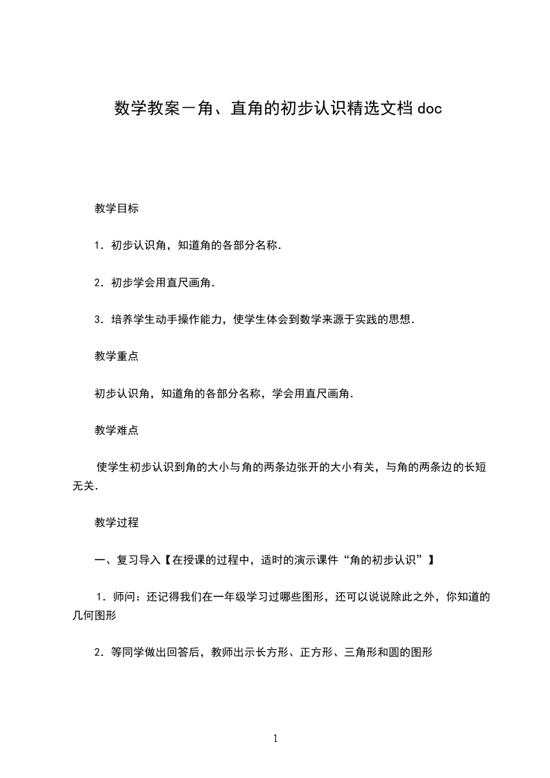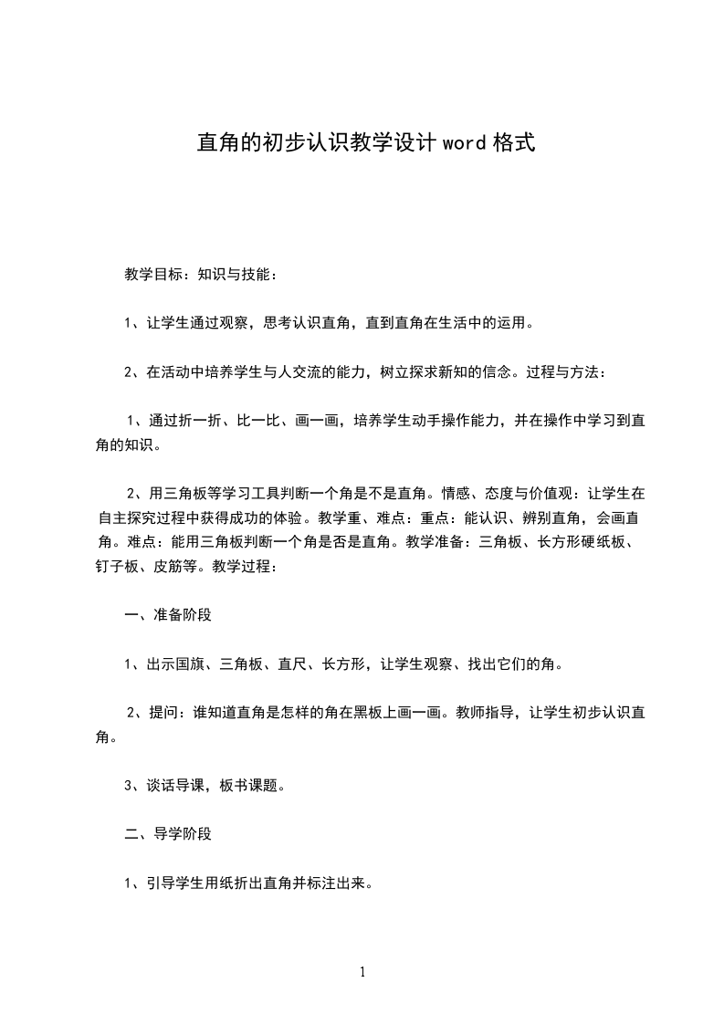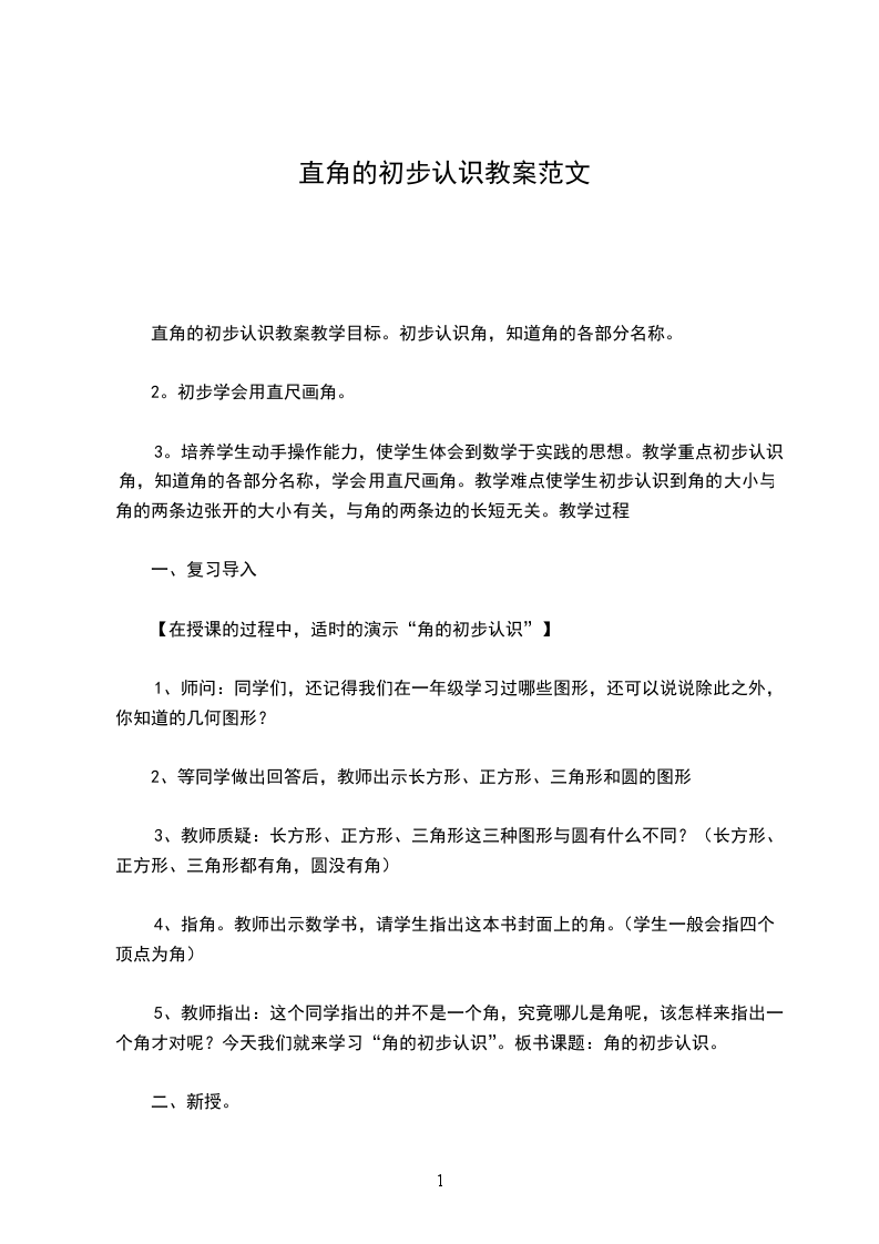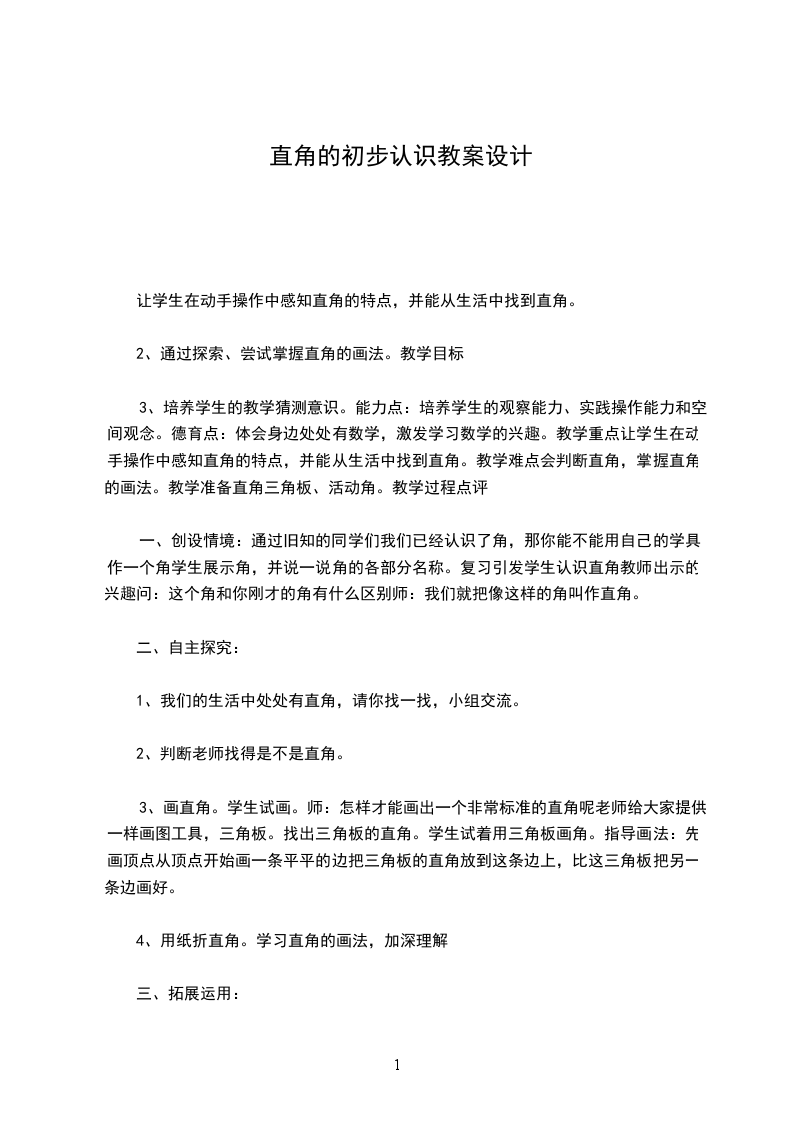 四、小结教师:我们学习的直角是一种特殊的角。它在我们日常生活中用处很多,在几何知识中也占很重要的地位。直角的初步认识教案3教学内容:课本直角的初步认识及“做做画画”练习二十六第59题。教学要求: