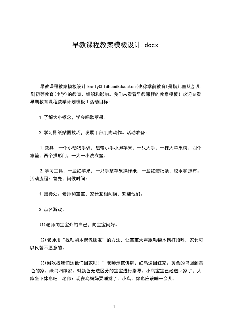 早教课程教案模板设计EarlyChldhoodEducaton(也称学前教育)是指儿童从胎儿到初等教育(小学)的教育、组织和影响。我们来看看早教课程的教案模板!欢迎查看!早期教育课程教学计划模板1活动目标:
