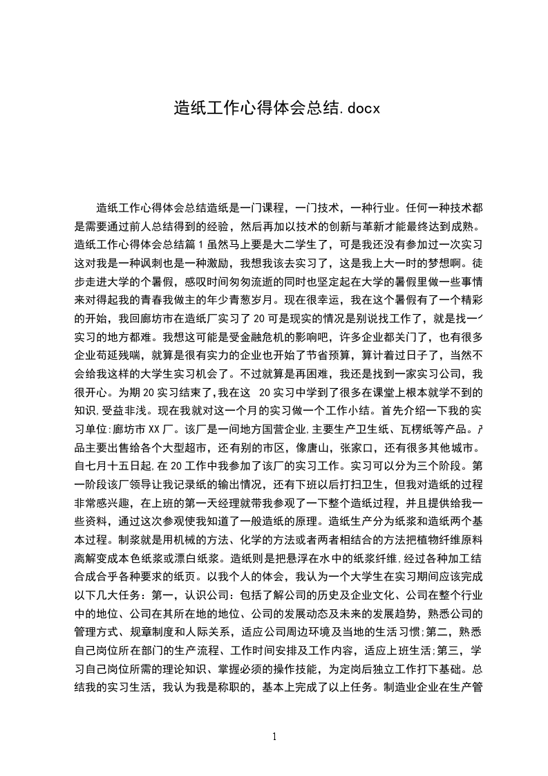 造纸工作心得体会总结造纸是一门课程,一门技术,一种行业。任何一种技术都是需要通过前人总结得到的经验,然后再加以技术的创新与革新才能最终达到成熟。造纸工作心得体会总结篇1虽然马上要是大二学生了,可是我还没有参加过一次实习,这对我是一种讽刺也是一种激励,我想我该去实习了,这是我上大一时的梦想啊。徒步走进大学的个暑假,感叹时间匆匆流逝的同时也坚定起在大学的暑假里做一些事情来对得起我的青春我做主的年少青葱岁月。现在很幸运,我在这个暑假有了一个精彩的开始,我回廊坊市在造纸厂实习了20可是现实的情况是别说找工作了,就是找一个实习的地方都难。我想这可能是受金融危机的影响吧,许多企业都关门了,也有很多企业苟延残喘,就算是很有实力的企业也开始了节省预算,算计着过日子了,当然不会给我这样的大学生实习机会了。不过就算是再困难,我还是找到一家实习公司,我很开心。为期20实习结束了,我在这20实习中学到了很多在课堂上根本就学不到的知识,受益非浅。现在我就对这一个月的实习做一个工作小结。首先介绍一下我的实习单位:廊坊市XX厂。该厂是一间地方国营企业,主要生产卫生纸、瓦楞纸等产品。产品主要出售给各个大型超市,还有别的市区,像唐山,张家口,还有很多其他城市。自七月十五日起,在20工作中我参加了该厂的实习工作。实习可以分为三个阶段。第一阶段该厂领导让我记录纸的输出情况,还有下班以后打扫卫生,但我对造纸的过程非常感兴趣,在上班的第一天经理就带我参观了一下整个造纸过程,并且提供给我一些资料,通过这次参观使我知道了一般造纸的原理。造纸生产分为纸浆和造纸两个基本过程。制浆就是用机械的方法、化学的方法或者两者相结合的方法把植物纤维原料离解变成本色纸浆或漂白纸浆。造纸则是把悬浮在水中的纸浆纤维,经过各种加工结合成合乎各种要求的纸页。以我个人的体会,我认为一个大学生在实习期间应该完成以下几大任务:第一,认识公司:包括了解公司的历史及企业文化、公司在整个行业中的地位、公司在其所在地的地位、公司的发展动态及未来的发展趋势,熟悉公司的管理方式、规章制度和人际关系,适应公司周边环境及当地的生活习惯;第二,熟悉自己岗位所在部门的生产流程、工作时间安排及工作内容,适应上班生活;第三,学习自己岗位所需的理论知识、掌握必须的操作技能,为定岗后独立工作打下基础。总结我的实习生活,我认为我是称职的,基本上完成了以上任务。制造业企业在生产管理上存在着一些共同点,主要有以下几个控制要点:第一;劳动纪律和安全生产;第二,保证设备运行平稳和故障的及时、高效处理;第三,工作区和休息区的5S管理;第四,安全隐患和设备故障隐患的排查;第五,生产计划安排和产品质量控制;第六,生产成本控制。这些是在制造业企业工作要掌握的基本内容。在实习过程中我参观了造纸的整个过程,制浆造纸是制造业中典型的连续化、流程型生产模式,一般企业规模都比较大、流程线比较长,需要学习和掌握的东西就比较多。作为一家生产中高档文化纸的大型企业,理所当然具有以上特点。分为备料、蒸煮和洗筛漂三个主要工段和供水、污水处理两个辅助工序(负责污水处理的中段水已划归制造部直接管理)。备料工段是制浆生产线的初始工段,现在由蒸煮班长统一管理。这个工段完成原料(竹片)的切碎(得到符合工艺范围要求的合格料片)、筛选(将不合格料片去除进行再处理,将合格料片送入皮带输送机)、水洗(将合格料片进行洗涤,洗出其中的杂质,进一步提高料片质量)、输送(通过提升机和皮带输送机等设备将合格料片送入蒸煮锅内,为蒸煮做好准备)几个环节,合格料片要求大小、长短、厚度符合工艺要求,水分含量适中,杂质尽量接近于零,每锅料片中的青篾、霉烂竹片的比例尽量小。经理向我们介绍了控制要点:第一,装锅时间和装锅进度;第二,料片水洗后的质量;第三,排污沟的水位控制;第四,水洗机水量大小的控制及异常处理;第五,其他事项。刚开始一段时间因为不熟悉工作,造成有些方面控制得好,有些方面控制不得力。听着经理的介绍,原来造纸也这么麻烦啊蒸煮工段是制浆生产线的第二个工段,备料工段所生产的合格料片在这里通过蒸煮药液的渗透,发生化学反应、物理反应和生物反应,通过蒸煮系统高温、高压的控制,在一定程度上处除阻碍料片成浆的元素,生产出符合工艺要求的粗浆,送洗筛漂工段进行下一步处理。在蒸煮工段实习的任务是要掌握蒸煮工段的工艺流程、工艺参数及控制要点,尤其是要掌握蒸煮工段DCS自动化控制系统的微机操作,这也是前期实习的重点内容。蒸煮工段的整个设备分为蒸煮系统、蒸煮药液系统、送浆系统和热回收系统等,外加一个DCS自动化控制系统操控全局。蒸煮系统的设备主要有蒸煮锅并附带装锅器,蒸煮药液系统的设备主要有药液循环泵、药液加热器、药液计量槽及存储槽、药液捕集器、药液循环管道等,送浆系统设备主要有喷放锅、送浆泵及其管道;热回收系统设备主要有污热水槽、污热水交换器、污热水过滤机、污热水交换泵、喷射冷凝器和螺旋换热器等,蒸煮生产的控制要点主要有以下几点:第一,装锅料片质量和装锅量;第二,蒸煮白液和黑液送入量(根据总液、液