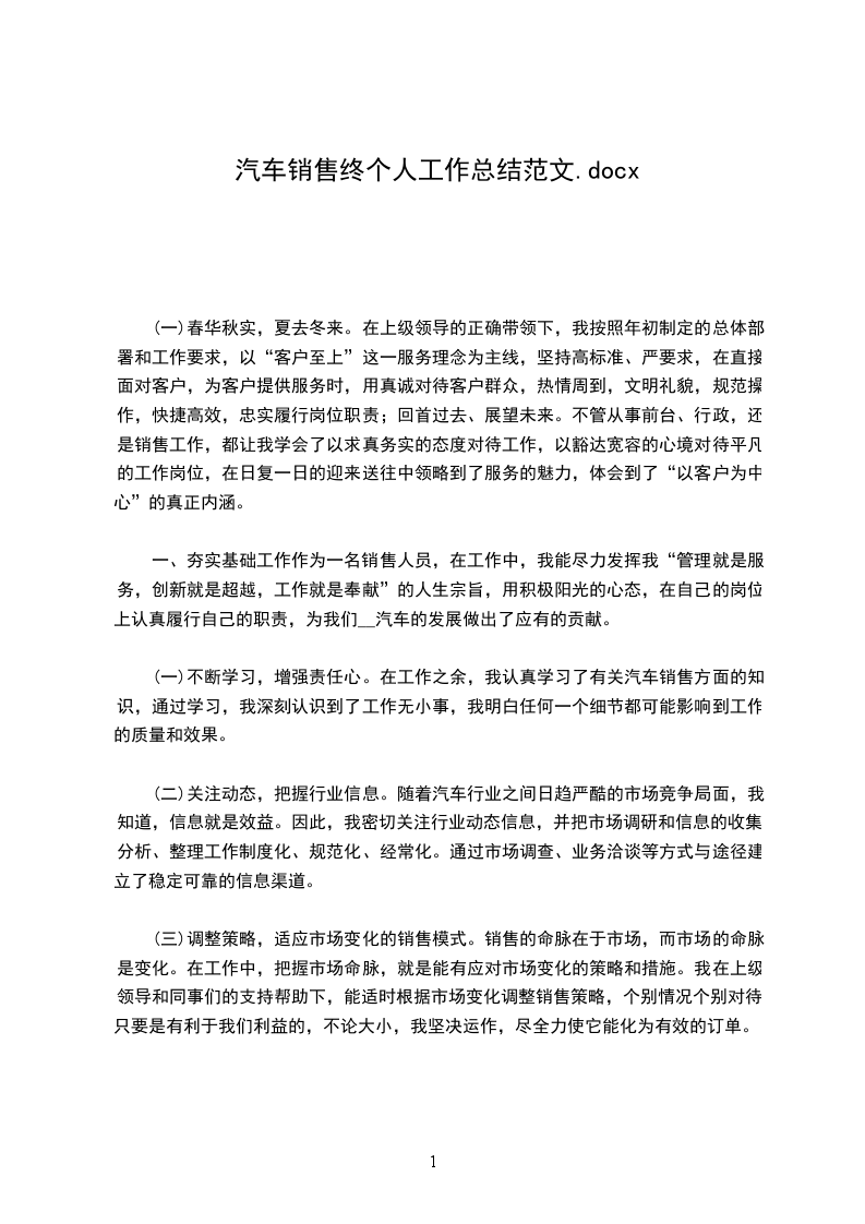 一、夯实基础工作作为一名销售人员,在工作中,我能尽力发挥我管理就是服务,创新就是超越,工作就是奉献的人生宗旨,用积极阳光的心态,在自己的岗位上认真履行自己的职责,为我们_汽车的发展做出了应有的贡献。