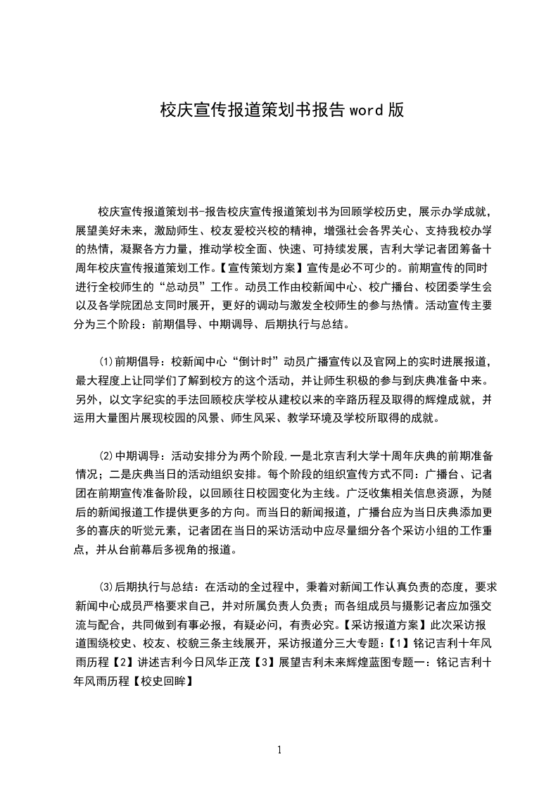 校庆宣传报道策划书-报告校庆宣传报道策划书为回顾学校历史,展示办学成就,展望美好未来,激励师生、校友爱校兴校的精神,增强社会各界关心、支持我校办学的热情,凝聚各方力量,推动学校全面、快速、可持续发展,吉利大学记者团筹备十周年校庆宣传报道策划工作。【宣传策划方案】宣传是必不可少的。前期宣传的同时进行全校师生的“总动员”工作。动员工作由校新闻中心、校广播台、校团委学生会以及各学院团总支同时展开,更好的调动与激发全校师生的参与热情。活动宣传主要分为三个阶段:前期倡导、中期调导、后期执行与总结。