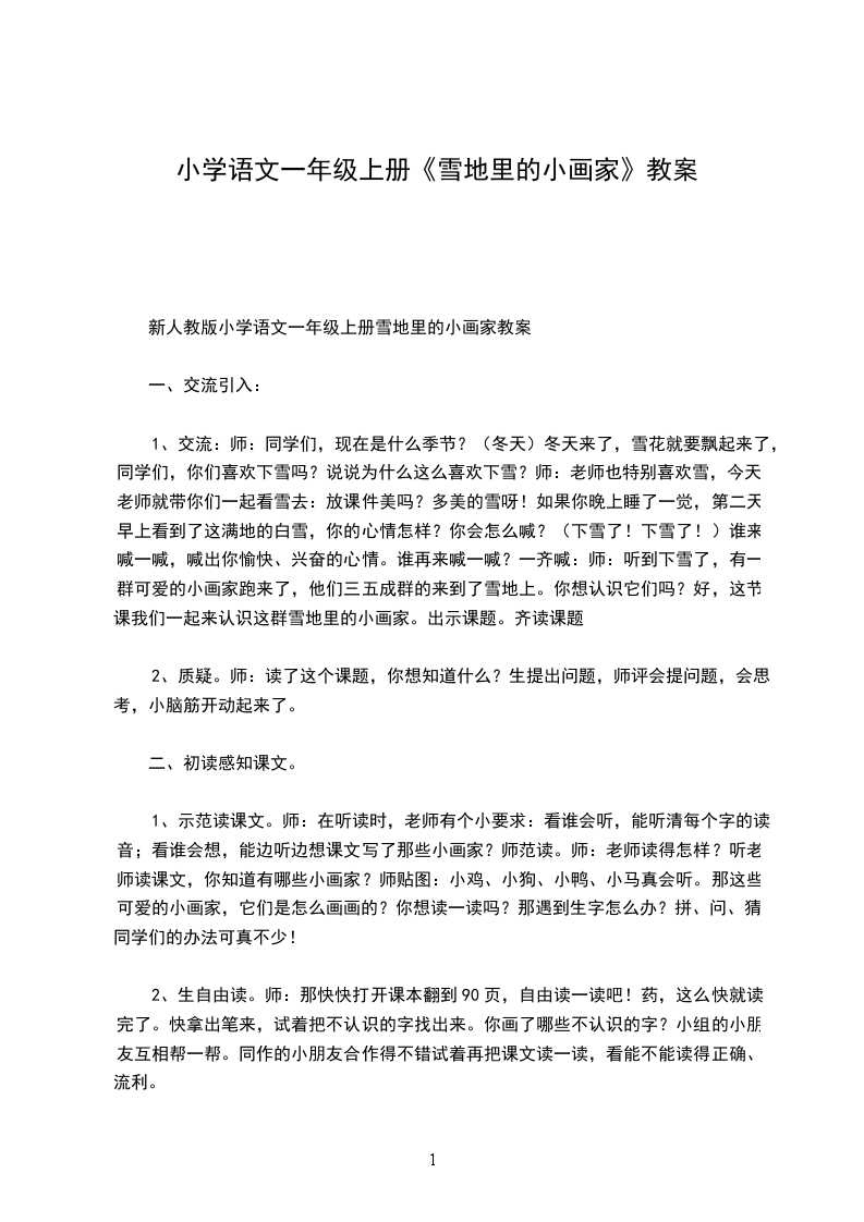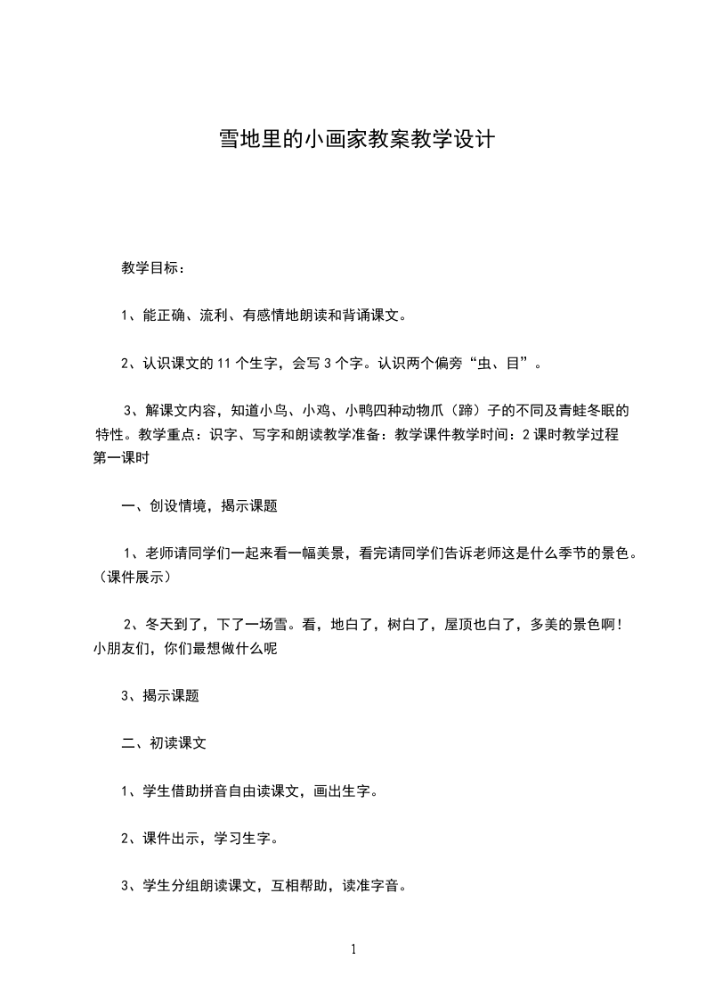 雪地里的小画家第一课时教学目标:1会用句型说话,生字掌握,多音字着学会。