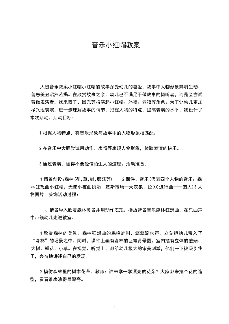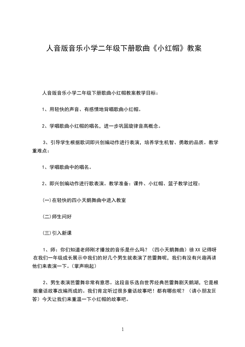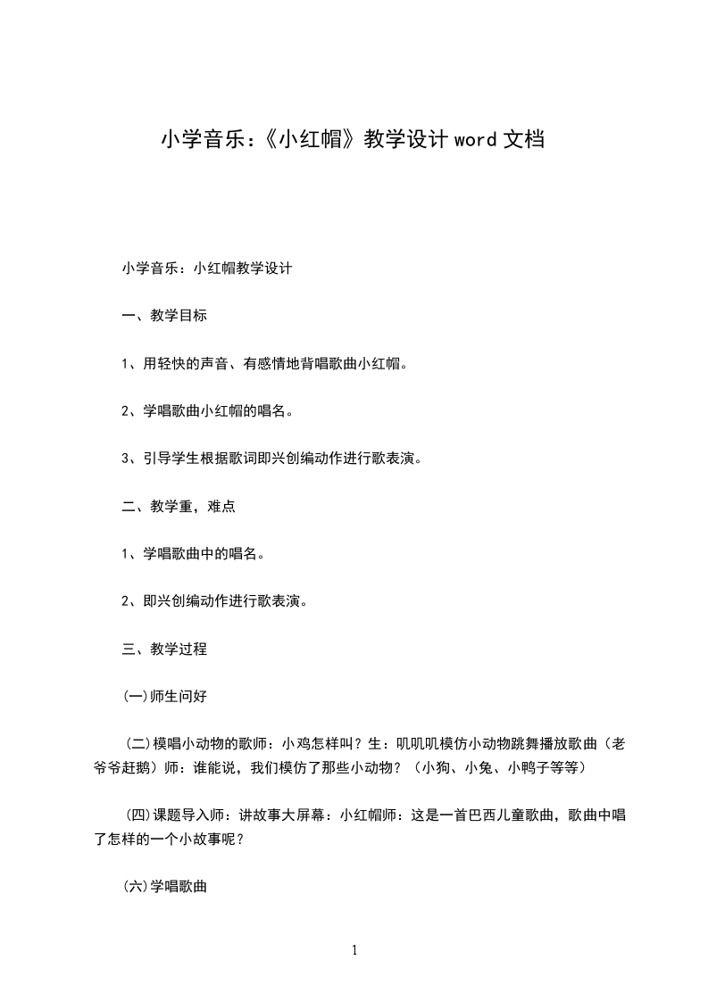 3学唱歌曲旋律;a、教师范唱,学生认真聆听。b、学生跟琴学唱歌曲旋律,教师及时纠正学生唱错的地方c、学生齐唱歌曲旋律4学唱歌词歌曲的旋律大家学的都非常得认真,唱得也非常好,我想要是加上歌词那一定是最好听最美的,现在就跟老师来学唱歌曲的歌词吧!。学习歌词之前我们先来跟着节奏读读歌词。a、老师读一小节,同学们跟老师读一小节,b、下面请同学们跟着节奏把歌词读一遍。c、同学们大家读得非常好,现在跟老师来学唱歌曲歌词吧!d、教师分小节教唱歌曲歌词e、学生分小节来学唱歌曲歌词f、跟琴来齐唱歌曲歌词g、这首歌的情绪是非常轻快,活泼的让学生带着这种情情绪来演唱歌曲5表演歌曲我们已经学会了这首歌曲,大家喜欢这首歌曲吗?(生答:喜欢)那我们用那种方式来表演歌曲呢,同学们你们想一想。(学生答:舞蹈、演情景剧)a、学生根据歌曲歌词,分小组来创编舞蹈动作(教师可以给学生指导)b、个别小组还可以根据这个故事情节来创编情景剧,分角色来表演歌曲。c、让学生分组来表演歌曲d、让表演比较好的一组上讲台表演。e、可以让学生给歌曲配上打击乐器表演6教师小结同学们小红帽通过自己的机智战胜了大灰狼,这个结果你们满意吗?生答:满意,那你们要是遇见大灰狼这样的坏人该怎么办呢?你们可要好好的想办法。同学们时间过的真快,下课了希望音乐会带给你们快乐。同学们让我们带着快乐去享受属于自己的课间十分钟吧。(听音乐走出教室)