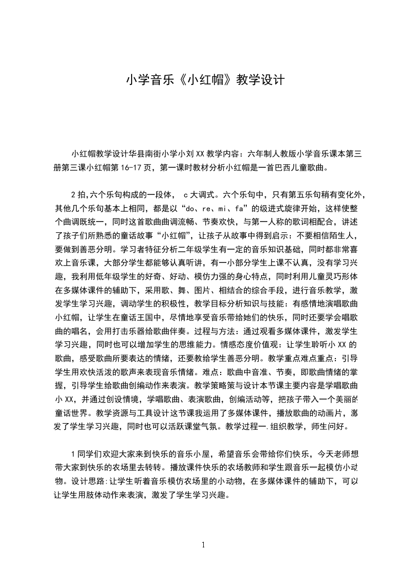 2拍,六个乐句构成的一段体,c大调式。六个乐句中,只有第五乐句稍有变化外,其他几个乐句基本上相同,都是以“do、re、mi、fa”的级进式旋律开始,这样使整个曲调既统一,同时这首歌曲曲调流畅、节奏欢快,与第一人称的歌词相配合,讲述了孩子们所熟悉的童话故事“小红帽”,让孩子从故事中得到启示:不要相信陌生人,要做到善恶分明。学习者特征分析二年级学生有一定的音乐知识基础,同时都非常喜欢上音乐课,大部分学生都能够认真听讲,有一小部分学生上课不认真,没有学习兴趣,我利用低年级学生的好奇、好动、模仿力强的身心特点,同时利用儿童灵巧形体,在多媒体课件的辅助下,采用歌、舞、图片、相结合的综合手段,进行音乐教学,激发学生学习兴趣,调动学生的积极性,教学目标分析知识与技能:有感情地演唱歌曲小红帽,让学生在童话王国中,尽情地享受音乐带给她们的快乐,同时还要学会唱歌曲的唱名,会用打击乐器给歌曲伴奏。过程与方法:通过观看多媒体课件,激发学生学习兴趣,同时也可以增加学生的思维能力。情感态度价值观:让学生聆听小XX的歌曲,感受歌曲所要表达的情绪,还要教给学生善恶分明。教学重点难点重点:引导学生用欢快活泼的歌声来表现音乐情绪。难点:歌曲中音准、节奏,即歌曲情绪的掌握,引导学生给歌曲创编动作来表演。教学策略策与设计本节课主要内容是学唱歌曲小XX,并通过创设情境,学唱歌曲、表演歌曲,创编活动等,把孩子带入一个美丽的童话世界。教学资源与工具设计这节课我运用了多媒体课件,播放歌曲的动画片,激发了学生学习兴趣,同时也可以活跃课堂气氛。教学过程一.组织教学,师生问好。