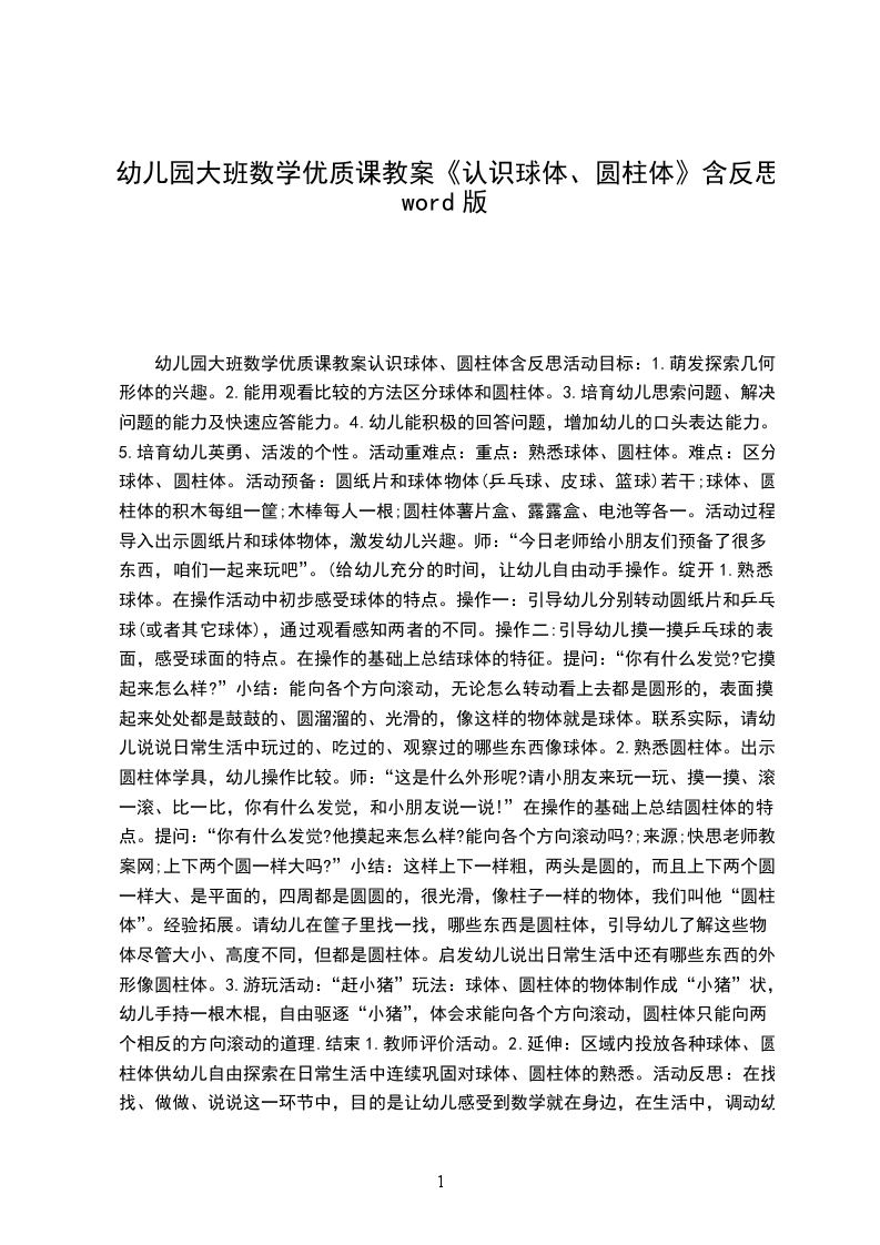 一、说教材幼儿在日常生活中常常接触到,但是幼儿对圆柱体的认圆柱体是一种常见的立体几何图形,幼识是模糊的,并且很难联系到社会中去。因此,在大班幼儿已熟悉了个中平面几何图形和球体的基础上,我进行了本次教学活动。