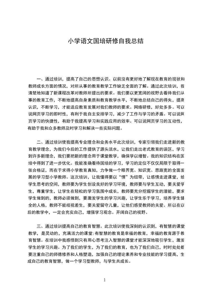 二、通过培训使我提高专业理念和业务水平此次培训,专家引领我们走进新的教育教学理念,为我们今后的工作提供了源头活水,让我们走出老式教育的误区,学习到许多新理念,我们要把新的理念用于课堂教学,确保学以增智。我的知识结构在国培中得到了进一步优化。我能准确看待国培的学习,学习的定位不仅仅局限于取得一张合格证,而在于求得小学教育真知,力争做一个眼界宽、知识宽、思路宽的全面发展的学习型小学教师。这次培训,让我懂得要以“情”为纽带,让感情走进课堂,给学生思考的空间,教师要为学生创设良好的学习环境,教师要与学生互动,要关爱学生,尊重学生,让学生在轻松的学习氛围中成长,教师要充分挖掘学生的潜能,要求学生做到的,教师必须做到,要激发学生的学习兴趣,让学生乐于学习,培养学生健全的人格,教师不能歧视差生,要关爱留守儿童,让他们感受教师的关爱。所以在以后的教学中,一定会充实自己,增强学习观念。开阔自己的视野。