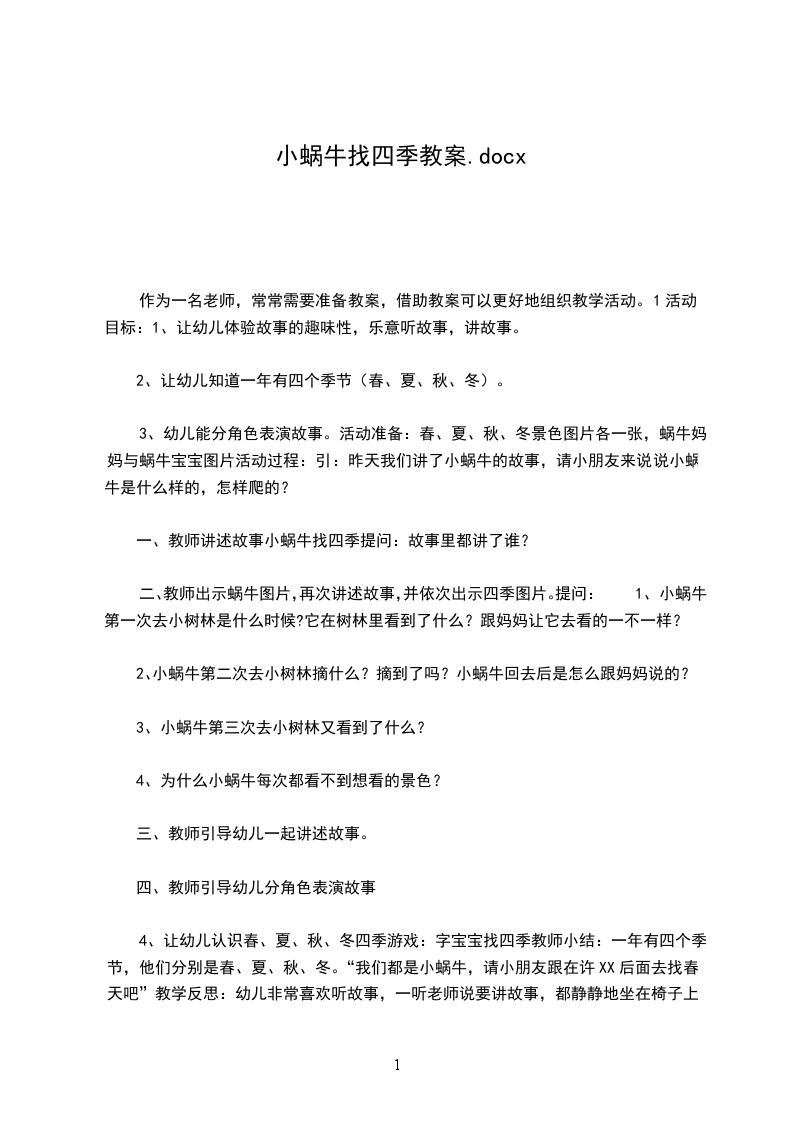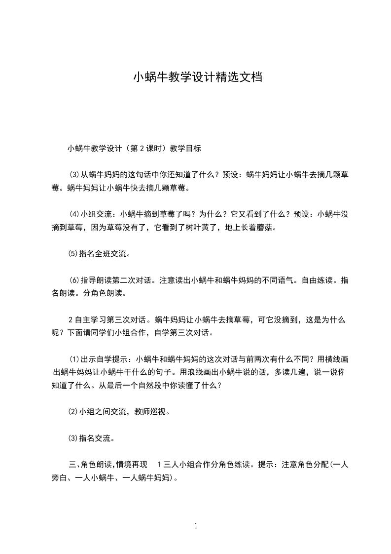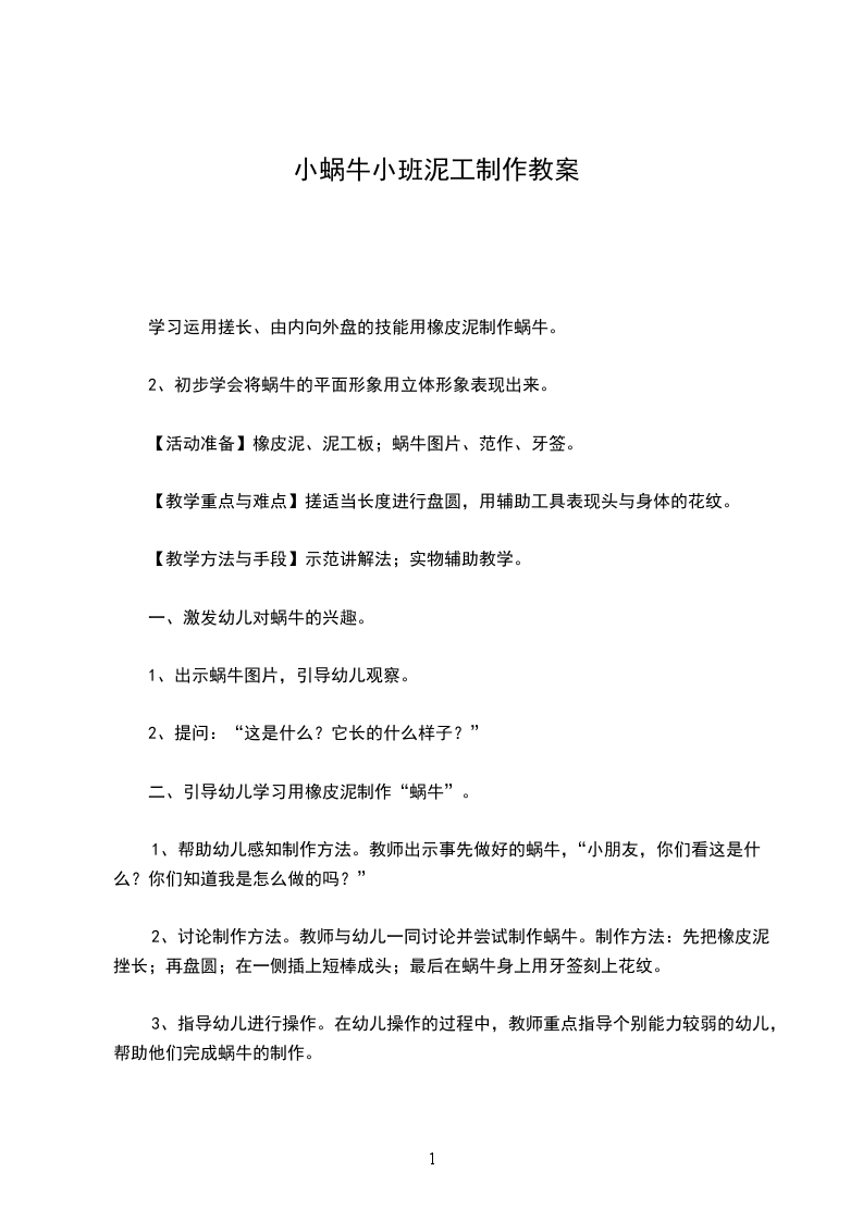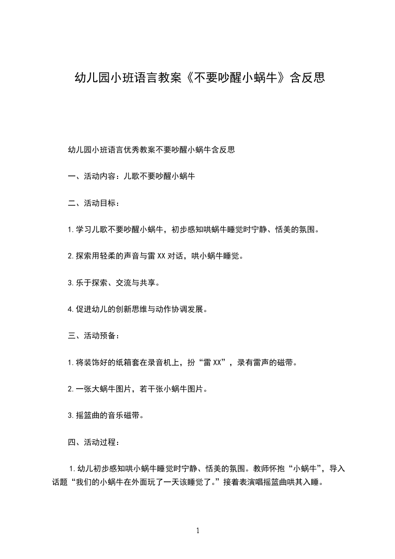 4.听音乐摇篮曲,教师启发幼儿,轻轻将小蜗牛送到小床上,让小蜗牛宁静地睡觉,再提示幼儿轻轻地、有序的离开教室。附儿歌不要吵醒小蜗牛雷公公,雷公公,请您清点打胡噜。我的蜗牛在睡觉,不要吵醒小蜗牛。活动反思:小班孩子对四周环境具有好奇心,尤其对小动物们布满了关爱之情,而孩子在言语表达上却存在怕生、不自然、甚至不愿说等现象。为了鼓舞孩子们愿说、敢说,我依据孩子的认知水平及生活经验选择、选择了这个儿歌。让孩子们通过操作小蜗牛、与其玩耍、说静静话、哄它入睡等环节,让孩子获得亲身体验关爱小蜗牛的情感,通过简洁重复的对话,使孩子渐渐获得一份情感的愉悦,从而延伸为内化的行为。