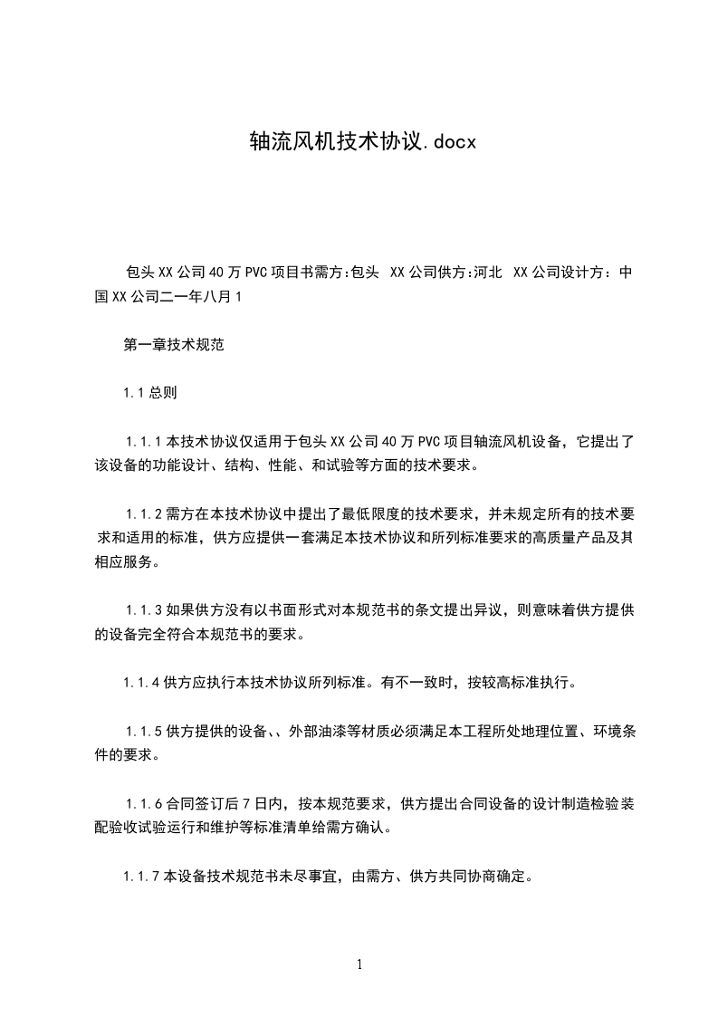 1.1.1本技术协议仅适用于包头XX公司40万PVC项目轴流风机设备,它提出了该设备的功能设计、结构、性能、和试验等方面的技术要求。