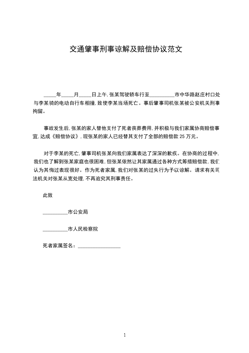 对于李某的死亡,肇事司机张某向我们家属表达了深深的歉疚。在协商的过程中,我们也了解到张某家庭也很困难,但张某依然让其家属通过各种方式筹措赔偿款,我们认为其悔过表现很好。作为死者家属,我们对张某的过失行为予以谅解。请求有关司法机关对张某从宽处理,不再追究其刑事责任。