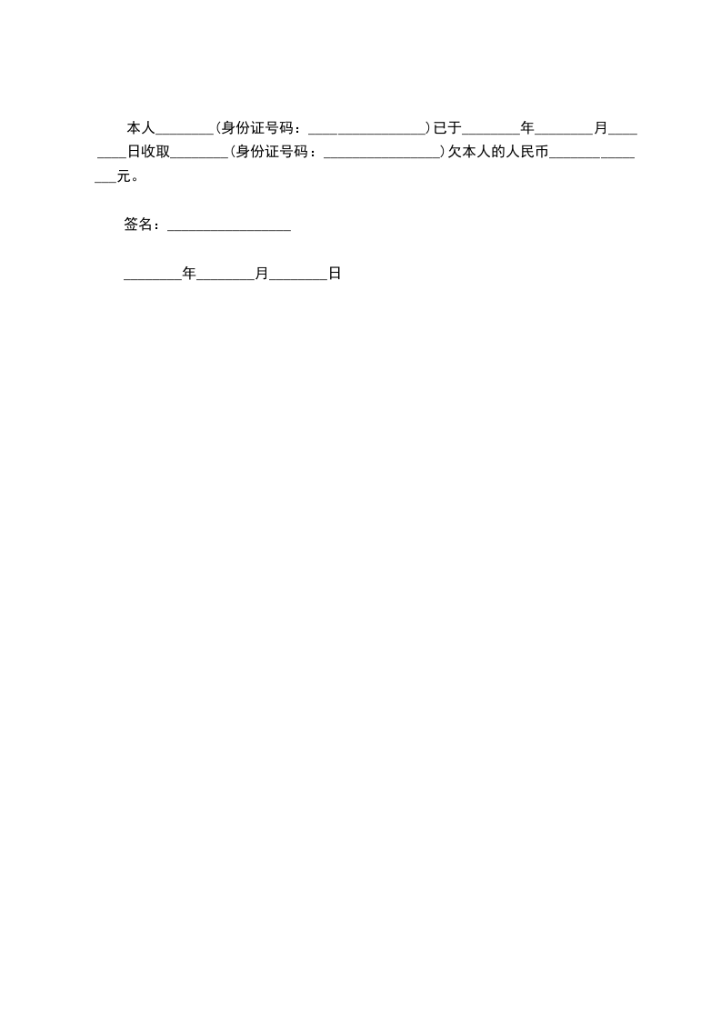 本人________(身份证号码:________________)已于________年________月________日收取________(身份证号码:________________)欠本人的人民币_______________元。