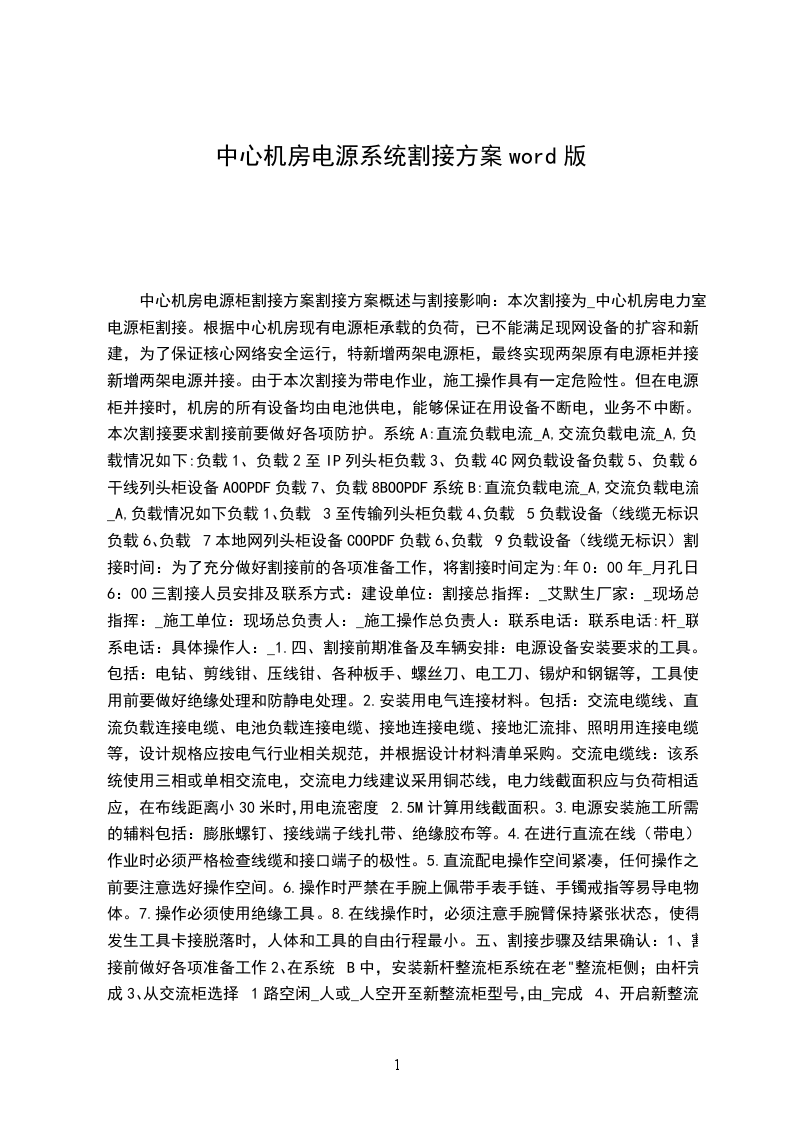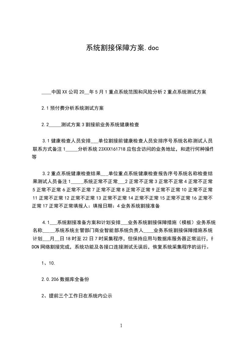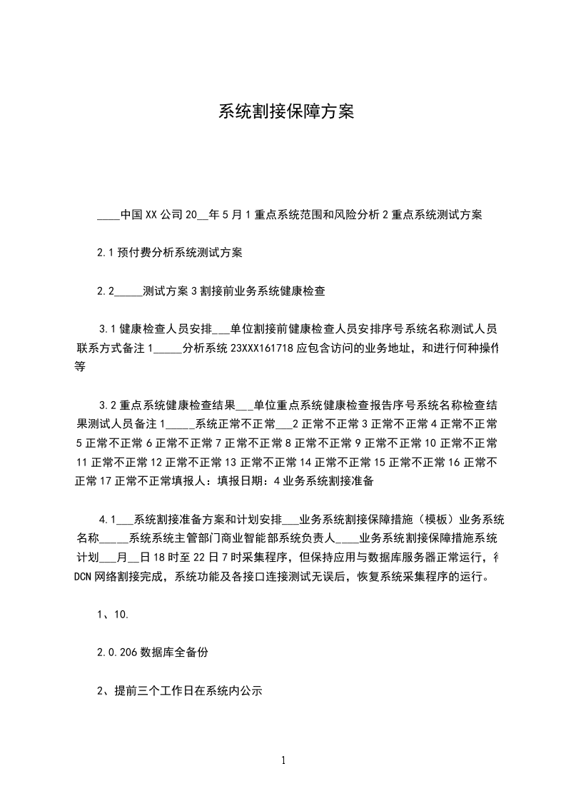 4.1___系统割接准备方案和计划安排___业务系统割接保障措施(模板)业务系统名称_____系统系统主管部门商业智能部系统负责人____业务系统割接保障措施系统计划___月__日18时至22日7时采集程序,但保持应用与数据库服务器正常运行,待DCN网络割接完成,系统功能及各接口连接测试无误后,恢复系统采集程序的运行。