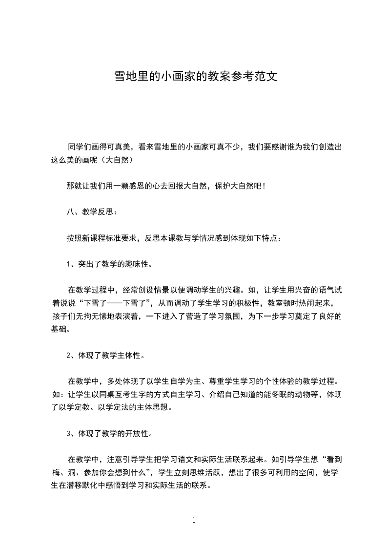 1.从前,在一个遥远的地方有一个美丽的森林王国。里面住着一群可爱的小动物。春天的时候,他们一起在花园里面追逐打闹。夏天来了,小动物们在树荫下乘凉。秋天到了,小动物们一起去采摘美味的果实。冬天到了,小动物们就更可开心啦,因为雪地里来了一群小画家-板书:雪地里的小画家。伸出手和老师一起来写课题。齐读课题.