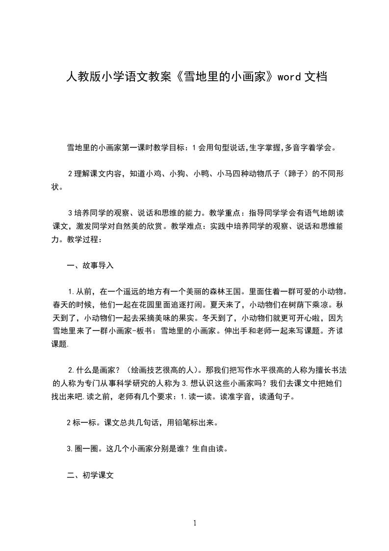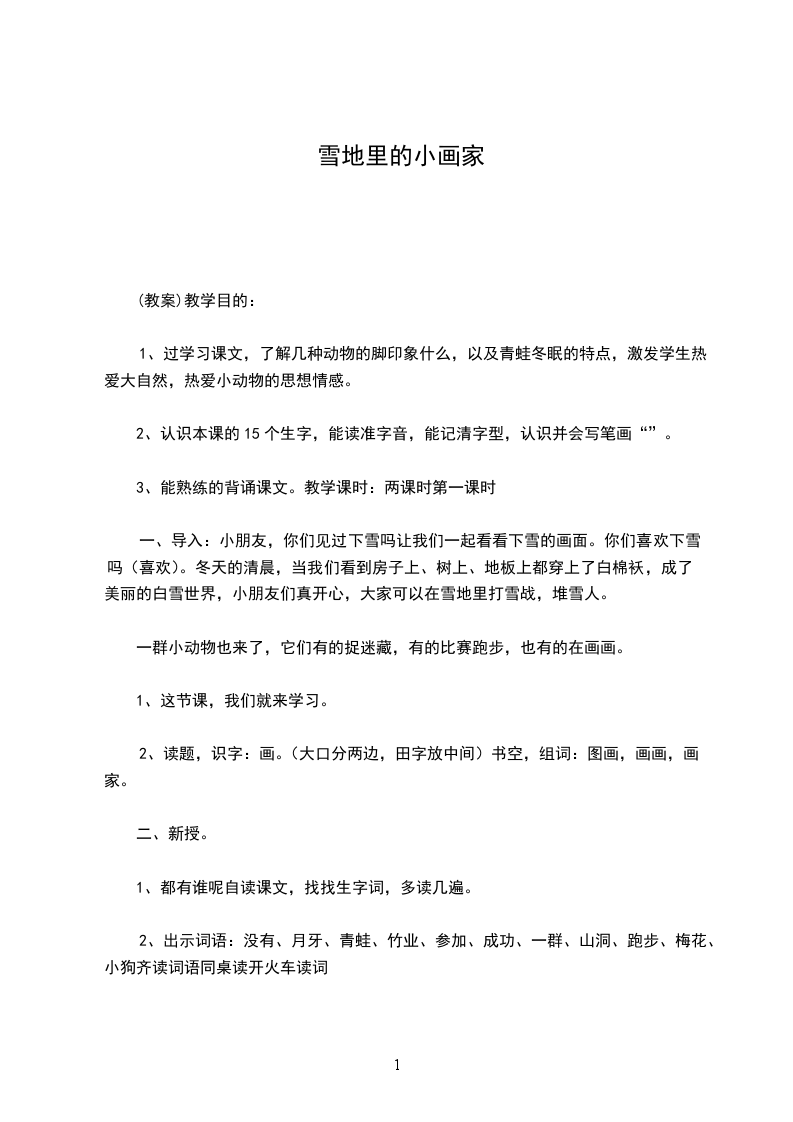 雪地里的小画家第一课时教学目标:1会用句型说话,生字掌握,多音字着学会。