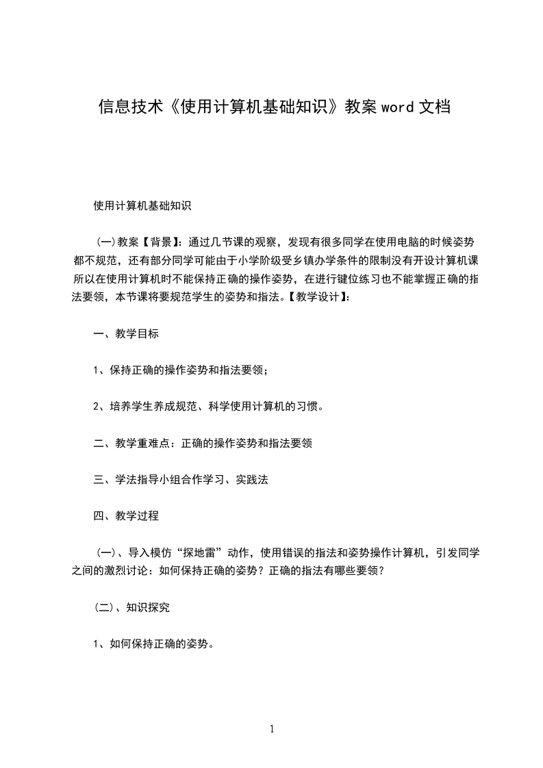 (一)教案【背景】:通过几节课的观察,发现有很多同学在使用电脑的时候姿势都不规范,还有部分同学可能由于小学阶级受乡镇办学条件的限制没有开设计算机课,所以在使用计算机时不能保持正确的操作姿势,在进行键位练习也不能掌握正确的指法要领,本节课将要规范学生的姿势和指法。【教学设计】: