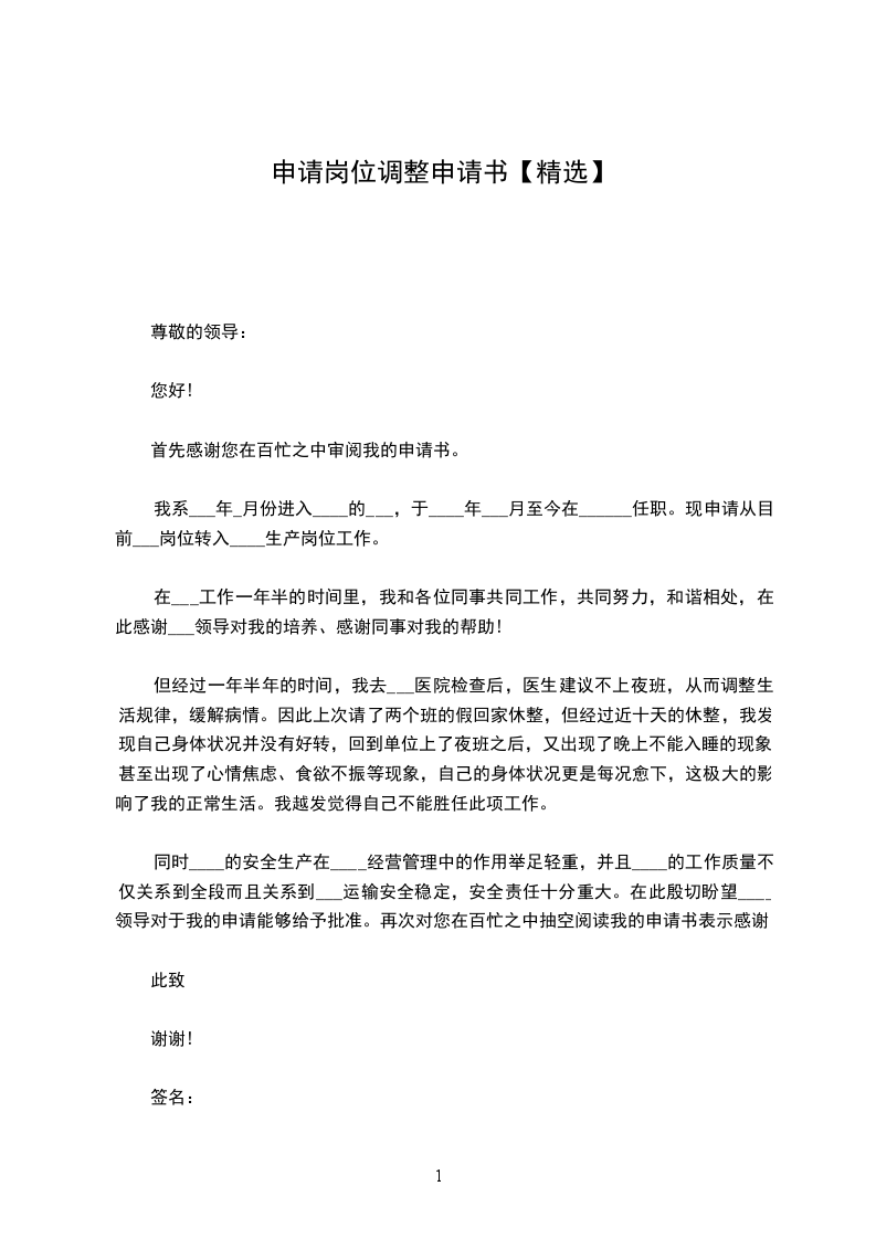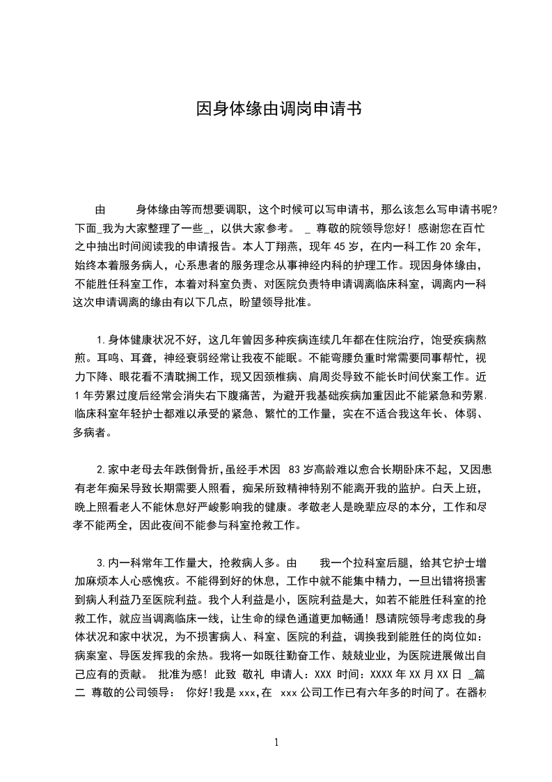 (二):工作岗位调动申请书公司人事部:您好,感谢您百忙之中抽空阅读此申请书。我叫___于__年__月份进入公司工作至今。现想申请调动目前___岗位到___岗位。在公司工作__年多的时间里,我都是在__岗位工作,不但学到了较多的专业知识,更是培养了我吃苦耐劳、勇于理解挑战的精神,还使我学到了更多做人的道理。在此,感谢公司领导对我的培养,感谢同事们对我的帮忙。本人现为了学到更多的知识,为了未来能够更好地展开工作,更好地为公司服务,打算继续求学深造。但鉴于本人求学的学习时间(夜大,需长期晚上上课)与此刻所工作的时间有冲突(__岗位需要实行三班倒工作)。为了不影响工作,同时思考到本人对__工作有极大的兴趣,现特向领导提出申请,调到__岗位工作。我是个比较外向的人,无论对生活还是工作,我都充满了热忱,用心乐观向上的态度使我能承受更大的压力,同时也使我充满了动力,良好的人格和性格使我与公司的同事们相处愉快,让我懂得更多与人相处的道理和技巧,所有这些,我相信,都对我将来在新的工作岗位上有很大帮忙。我很喜欢我们公司,在公司里工作感觉很幸福。我也很喜欢这份工作,或许没有__工作经验是我最大的不足之处,但这也是我最大的前进动力,我会努力学习,我相信,在公司的培训和我的勤奋努力下,我会在新的工作岗位做得更加出色的。恳请能得到领导的指导,并殷切盼望领导对于我的申请能够给予批准。再次对您百忙中抽空阅读本人的申请书表示感谢!此致敬礼申请人:___时间:20__年_月_日岗位调动申请书