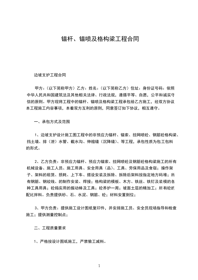 边坡支护工程合同甲方:(甲方现将工程中的锚杆、锚喷及格构梁工程承包给乙方施工,经双方协议,本工程施工内容事项,本着双方互利的原则,同意签订如下协议,相互遵守。