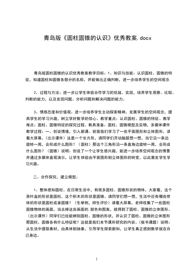 青岛版小学数学圆柱和圆锥的认识教学设计学习目标: