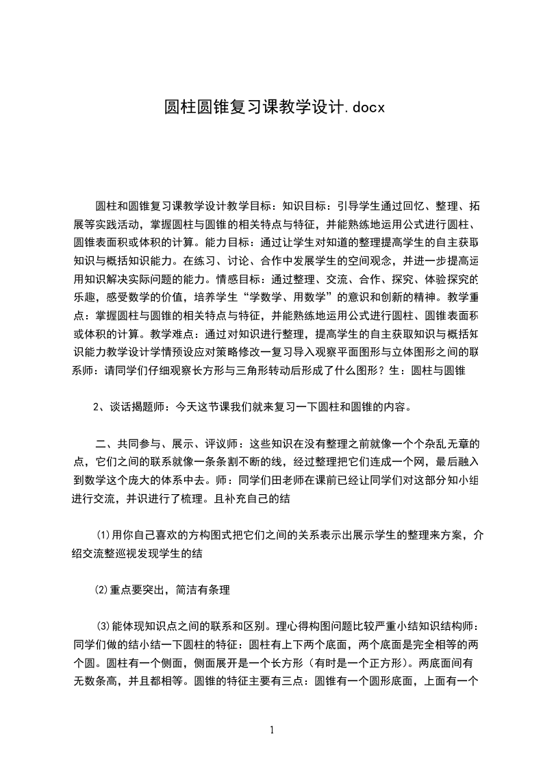 2、确立学习目标师:你还想圆柱圆锥的哪些知识进行深入研究?生答师:这节课主要研究圆柱、圆锥的特点