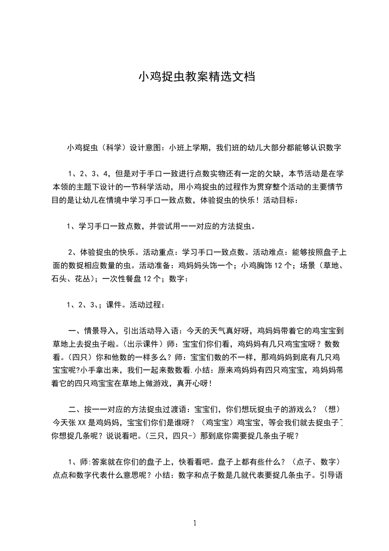 二、按一一对应的方法捉虫过渡语:宝宝们,你们想玩捉虫子的游戏么?(想)今天张XX是鸡妈妈,宝宝们你们是谁呀?(鸡宝宝)鸡宝宝,等会我们就去捉虫子了,你想捉几条呢?说说看吧。(三只,四只-)那到底你需要捉几条虫子呢?