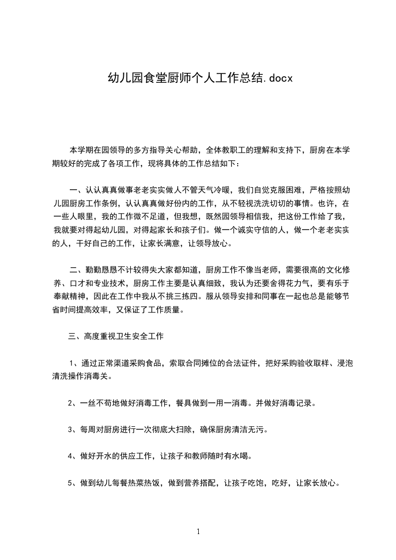 一、认认真真做事老老实实做人不管天气冷暖,我们自觉克服困难,严格按照幼儿园厨房工作条例,认认真真做好份内的工作,从不轻视洗洗切切的事情。也许,在一些人眼里,我的工作微不足道,但我想,既然园领导相信我,把这份工作给了我,我就要对得起幼儿园,对得起家长和孩子们。做一个诚实守信的人,做一个老老实实的人,干好自己的工作,让家长满意,让领导放心。