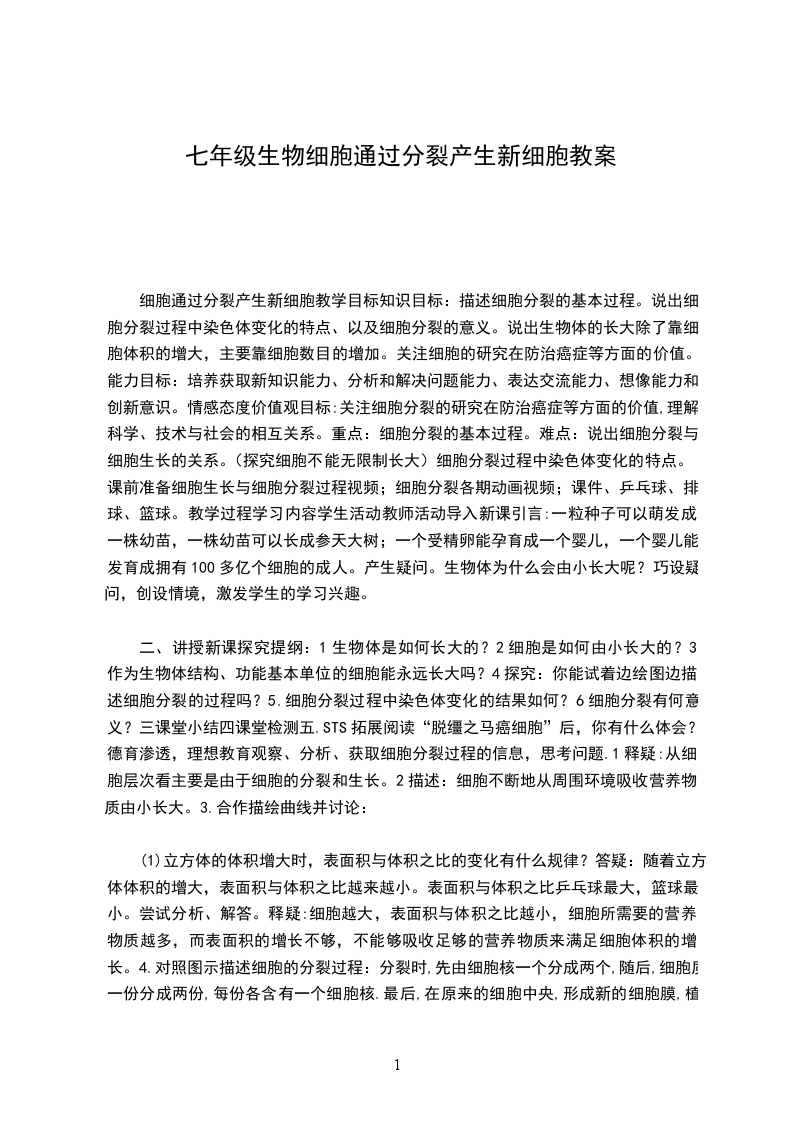 二、细胞生长教师活动:一切分苹果进行演示,设问,以此引导学生猜测。学生活动:理解细胞生长的概念,由此得出:生物体要生长,除了细胞分裂增加细胞数目之外,细胞还要生长使其体积增大。教师活动:追问“细胞能无限制的长大吗?”学生活动:观察和分析,理解。师生互动:以上我们所学的是一般的细胞的分裂。在自然界中还生存着一种“长生不老”的细胞癌细胞。请同学们阅读教材之后,师生共同讨论、交流,鼓励学生一定要好好学习,将来更好地为人类自己服务。课堂小结本节课我们了解了细胞生长和分裂与生物体长大的关系,细胞分裂的过程及染色体的变化。对细胞分裂在遗传物质的分配和生物体的长大方面有了一点认识。更多的还需要同学们在今后作进一步的学习与研究。下面我们来做一些课堂练习。巩固练习分层次安排检测本堂课学习效果的习题。布置作业“除了本节课学习的知识以外,你还想知道些什么?”通过各种途径查阅一些相关资料,以加强认识。教学反思板书设计第一节细胞通过分裂产生新细胞