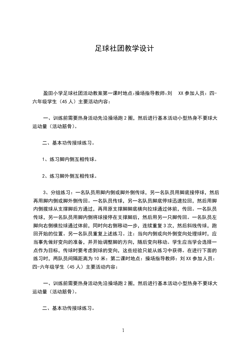 盈田小学足球社团活动教案第一课时地点:操场指导教师:刘XX参加人员:四-六年级学生(45人)主要活动内容: