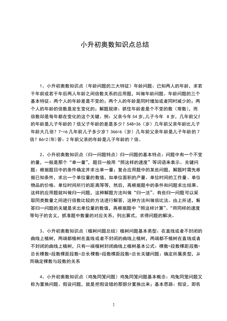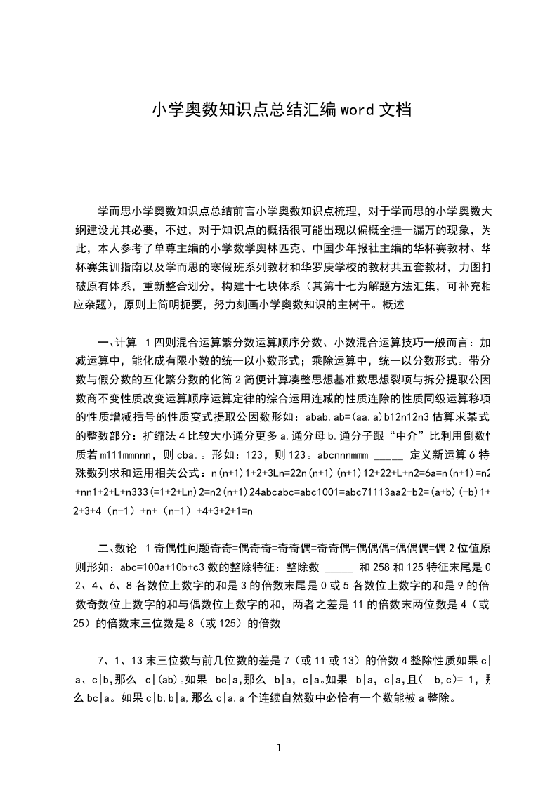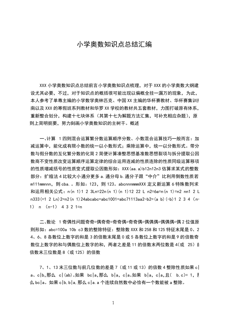XXX小学奥数知识点总结前言小学奥数知识点梳理,对于XXX的小学奥数大纲建设尤其必要,不过,对于知识点的概括很可能出现以偏概全挂一漏万的现象,为此,本人参考了单尊主编的小学数学奥林匹克、中国XX主编的华杯赛教材、华杯赛集训指南以及XXX的寒假班系列教材和华罗XX学校的教材共五套教材,力图打破原有体系,重新整合划分,构建十七块体系(其第十七为解题方法汇集,可补充相应杂题),原则上简明扼要,努力刻画小学奥数知识的主树干。概述