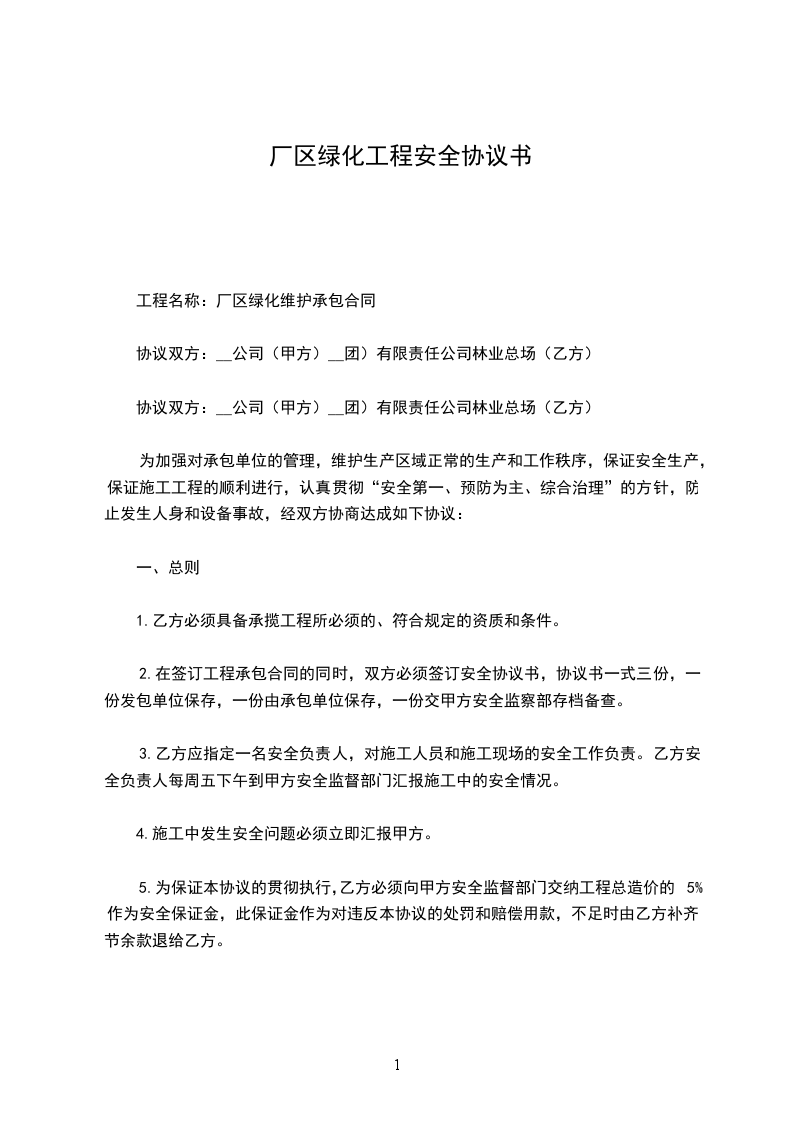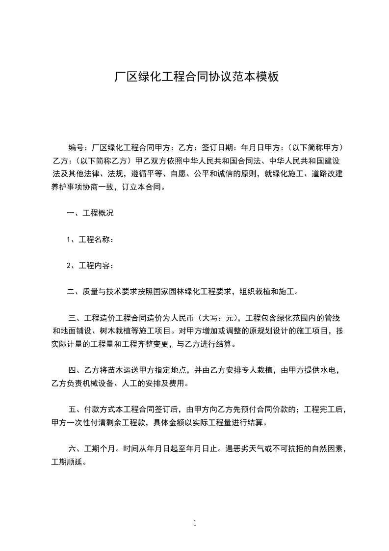 编号:厂区绿化工程合同甲方:乙方:签订日期:年月日甲方:(以下简称甲方)乙方:(以下简称乙方)甲乙双方依照中华人民共和国合同法、中华人民共和国建设法及其他法律、法规,遵循平等、自愿、公平和诚信的原则,就绿化施工、道路改建、养护事项协商一致,订立本合同。
