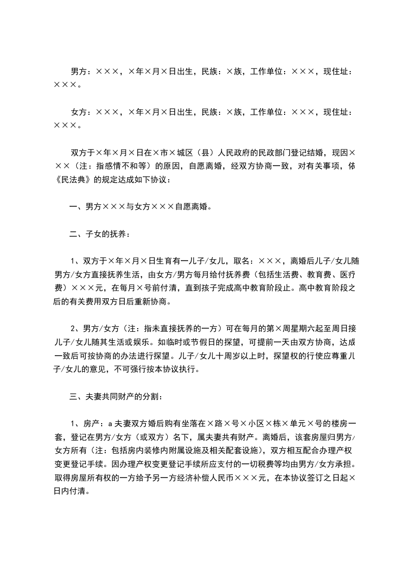 双方于×年×月×日在×市×城区(县)人民政府的民政部门登记结婚,现因×××(注:指感情不和等)的原因,自愿离婚,经双方协商一致,对有关事项,依《民法典》的规定达成如下协议: