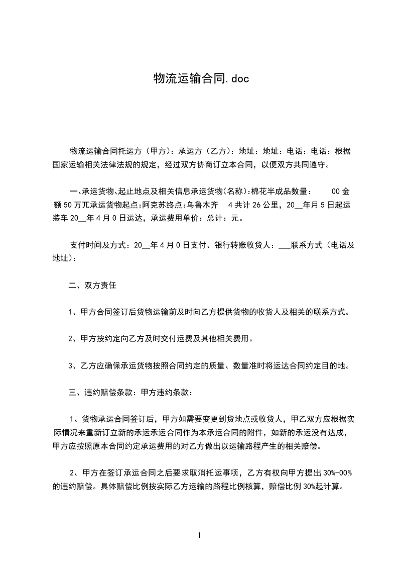 一、承运货物、起止地点及相关信息承运货物(名称):棉花半成品数量:00金额50万兀承运货物起点:阿克苏终点:乌鲁木齐4共计26公里,20__年月5日起运装车20__年4月0日运达,承运费用单价:总计:元。