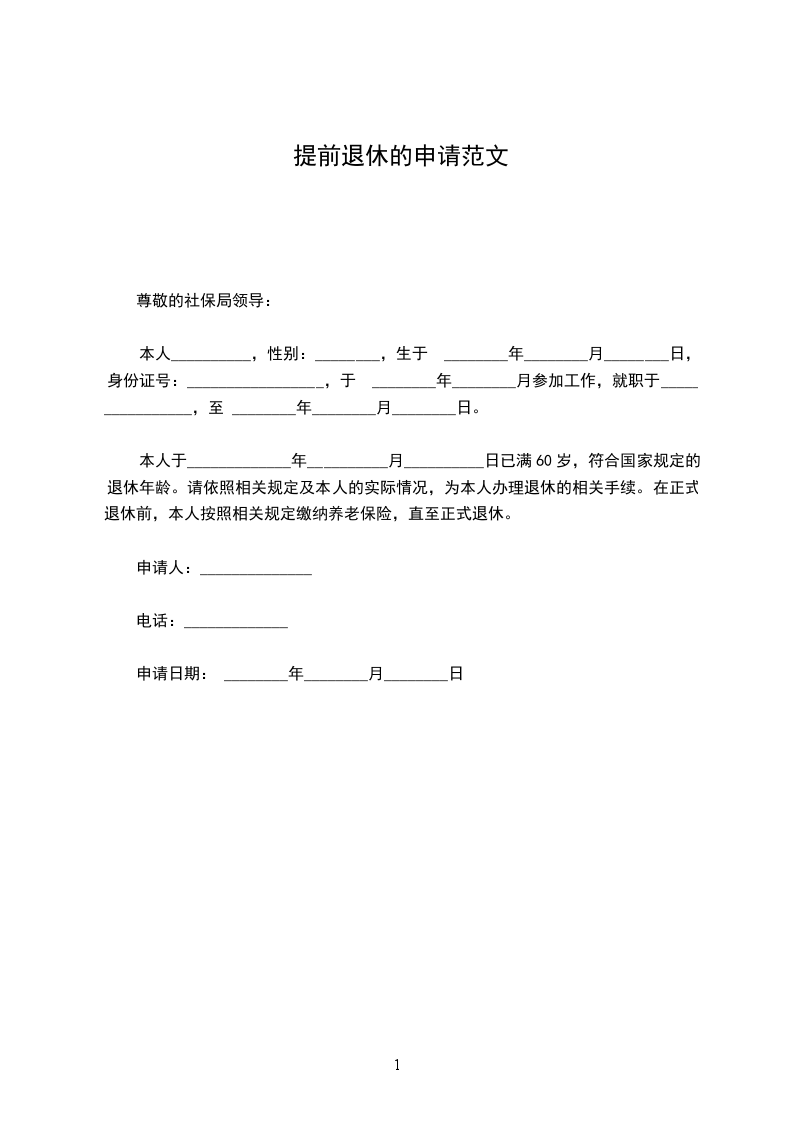 本人于_____________年__________月__________日已满60岁,符合国家规定的退休年龄。请依照相关规定及本人的实际情况,为本人办理退休的相关手续。在正式退休前,本人按照相关规定缴纳养老保险,直至正式退休。