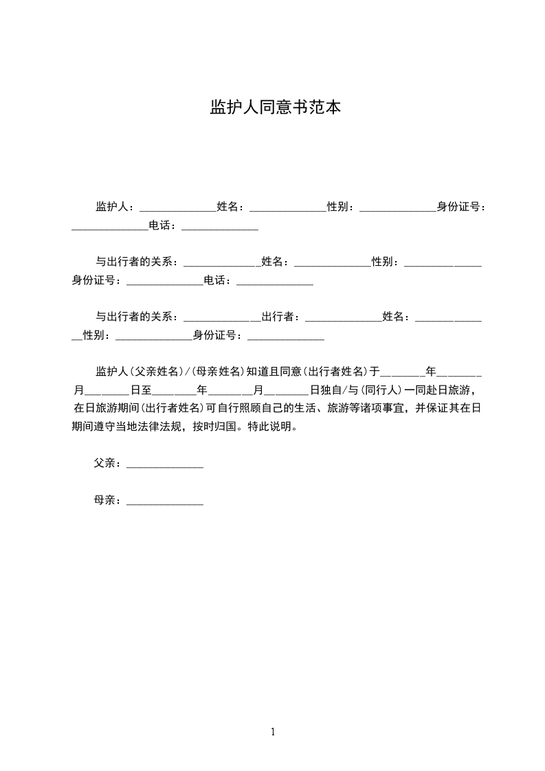 监护人(父亲姓名)/(母亲姓名)知道且同意(出行者姓名)于________年________月________日至________年________月________日独自/与(同行人)一同赴日旅游,在日旅游期间(出行者姓名)可自行照顾自己的生活、旅游等诸项事宜,并保证其在日期间遵守当地法律法规,按时归国。特此说明。