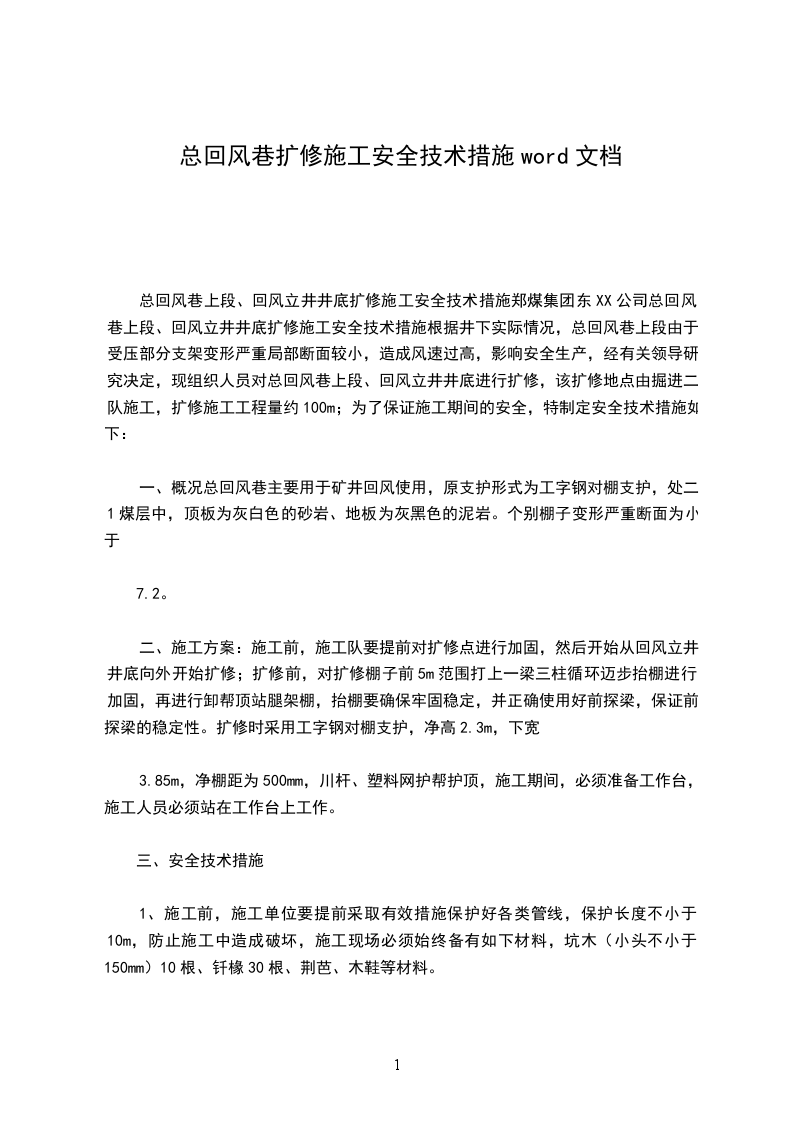 总回风巷上段、回风立井井底扩修施工安全技术措施郑煤集团东XX公司总回风巷上段、回风立井井底扩修施工安全技术措施根据井下实际情况,总回风巷上段由于受压部分支架变形严重局部断面较小,造成风速过高,影响安全生产,经有关领导研究决定,现组织人员对总回风巷上段、回风立井井底进行扩修,该扩修地点由掘进二队施工,扩修施工工程量约100m;为了保证施工期间的安全,特制定安全技术措施如下: