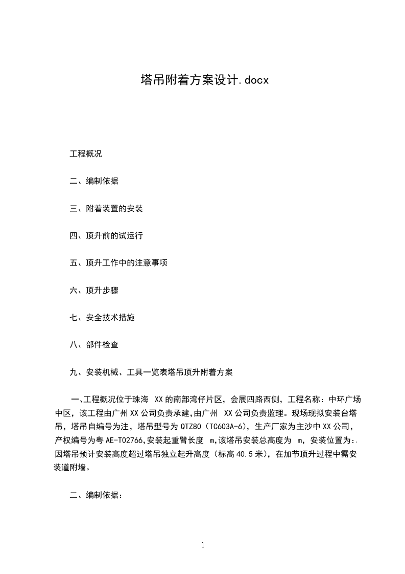 一、工程概况位于珠海XX的南部湾仔片区,会展四路西侧,工程名称:中环广场中区,该工程由广州XX公司负责承建,由广州XX公司负责监理。现场现拟安装台塔吊,塔吊自编号为注,塔吊型号为QTZ80(TC603A-6),生产厂家为主沙中XX公司,产权编号为粤AE-T02766,安装起重臂长度m,该塔吊安装总高度为m,安装位置为:。因塔吊预计安装高度超过塔吊独立起升高度(标高40.5米),在加节顶升过程中需安装道附墙。